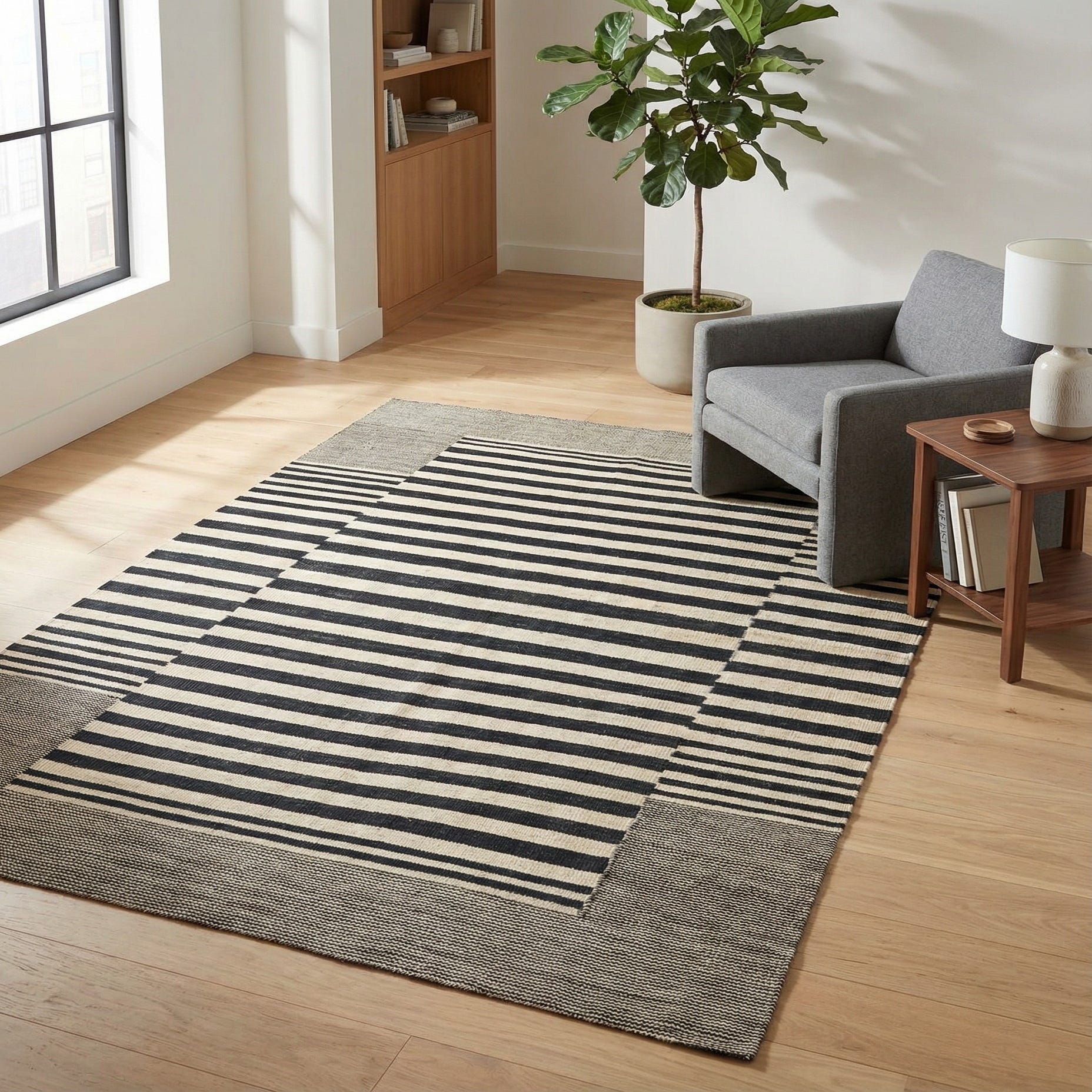 The Kilim Modern collection presents a 4x6 hand-woven rug crafted from 100% wool. This piece showcases a bold, graphic pattern with well-defined black stripes set against a cream background. The clean lines and contrasting hues of this design evoke a sense of contemporary simplicity, making it an ideal choice for modern and minimalist interiors.