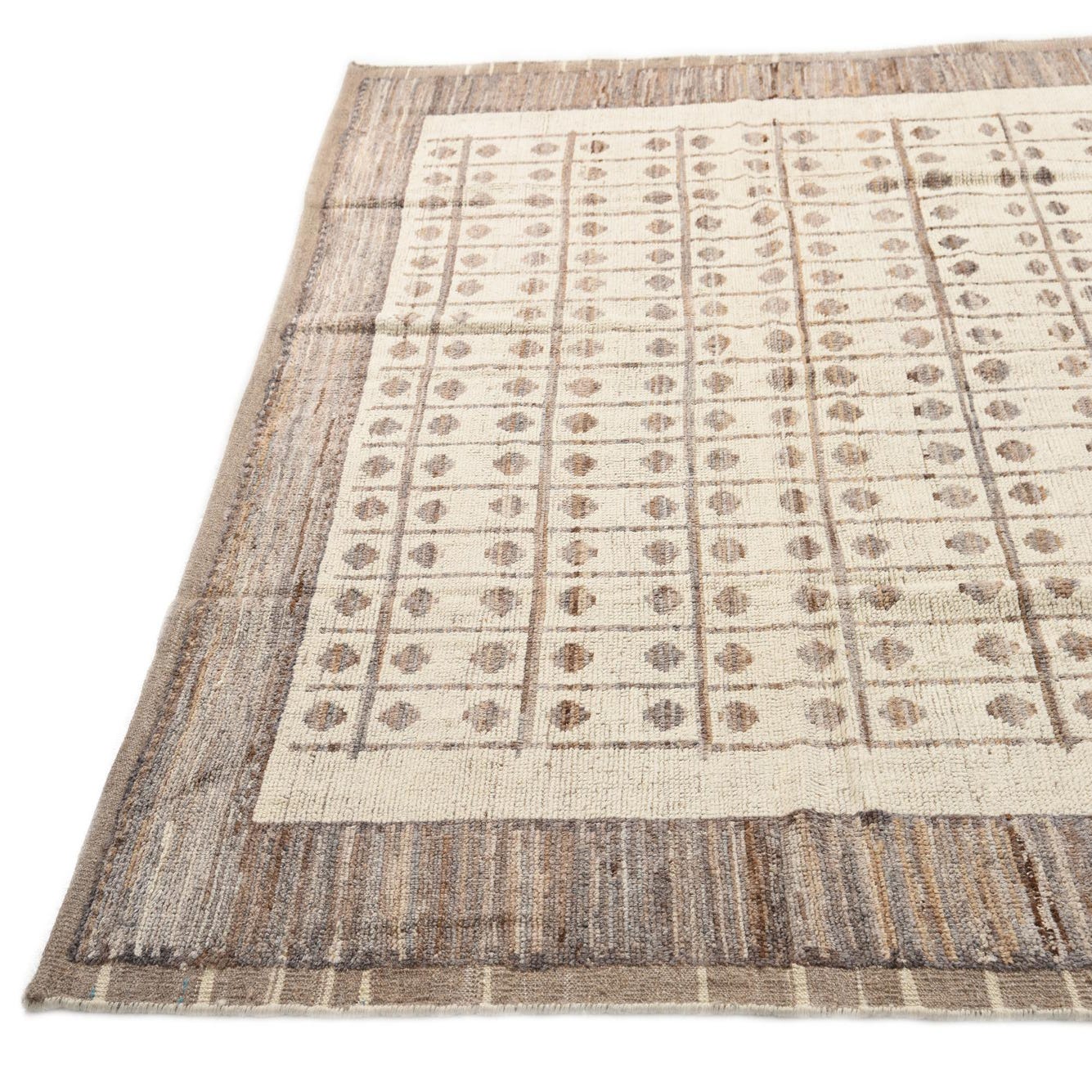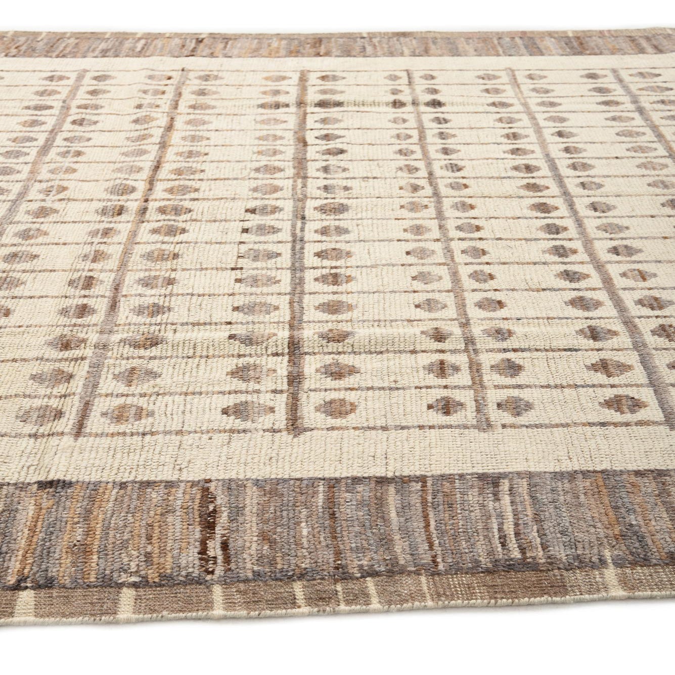 This Moroccan Collection rug is a tasteful addition to any space, offering a refined touch with its hand-knotted construction of 100% wool. The dimensions are a versatile 8x10, fitting well in a variety of room sizes. The design features a symmetrical pattern of geometric motifs, gracefully spread across a beige background, bordered with complementary shades of brown that lend an earthy warmth to the piece.