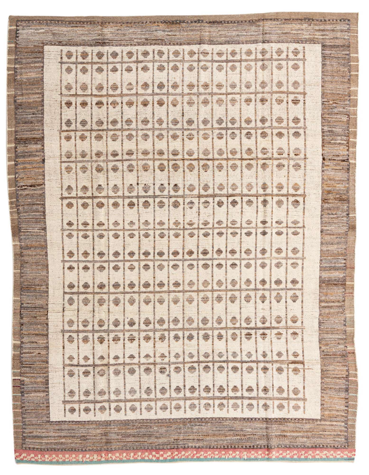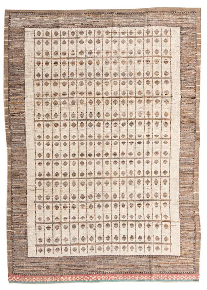 An 8x10 rectangular Moroccan shag rug with a cream center featuring a grid of brown tribal patterns, bordered by a textured brown frame.