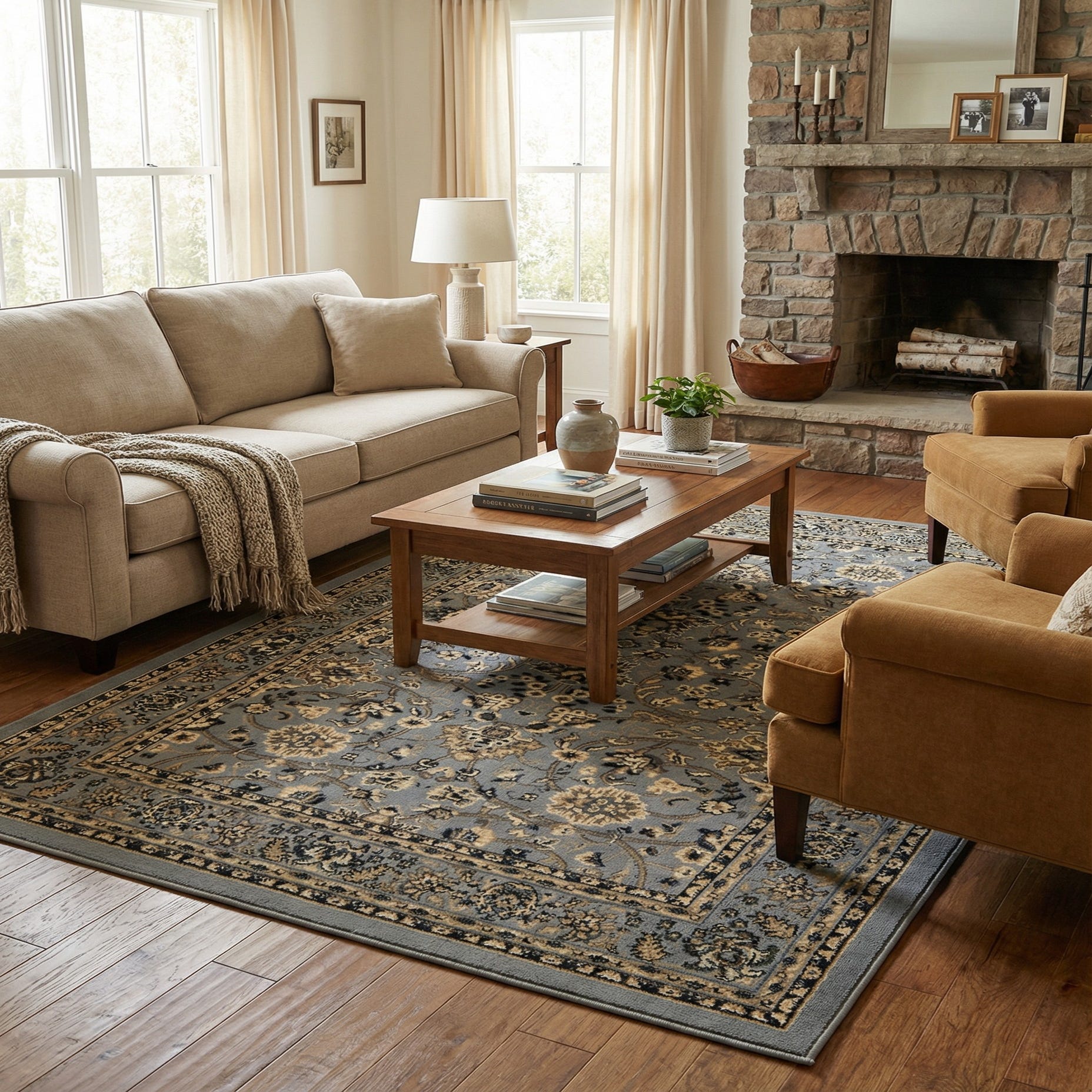This rug works well in transitional or traditional interiors where pattern and subtle color contrast are desired. Place it under a coffee table to anchor a seating area, in a foyer to set a composed tone, or in a study or bedroom to add layered texture over hardwood or tile. Its gray background and neutral accents make it easy to pair with cool blues and charcoals or warmer wood and leather furnishings.