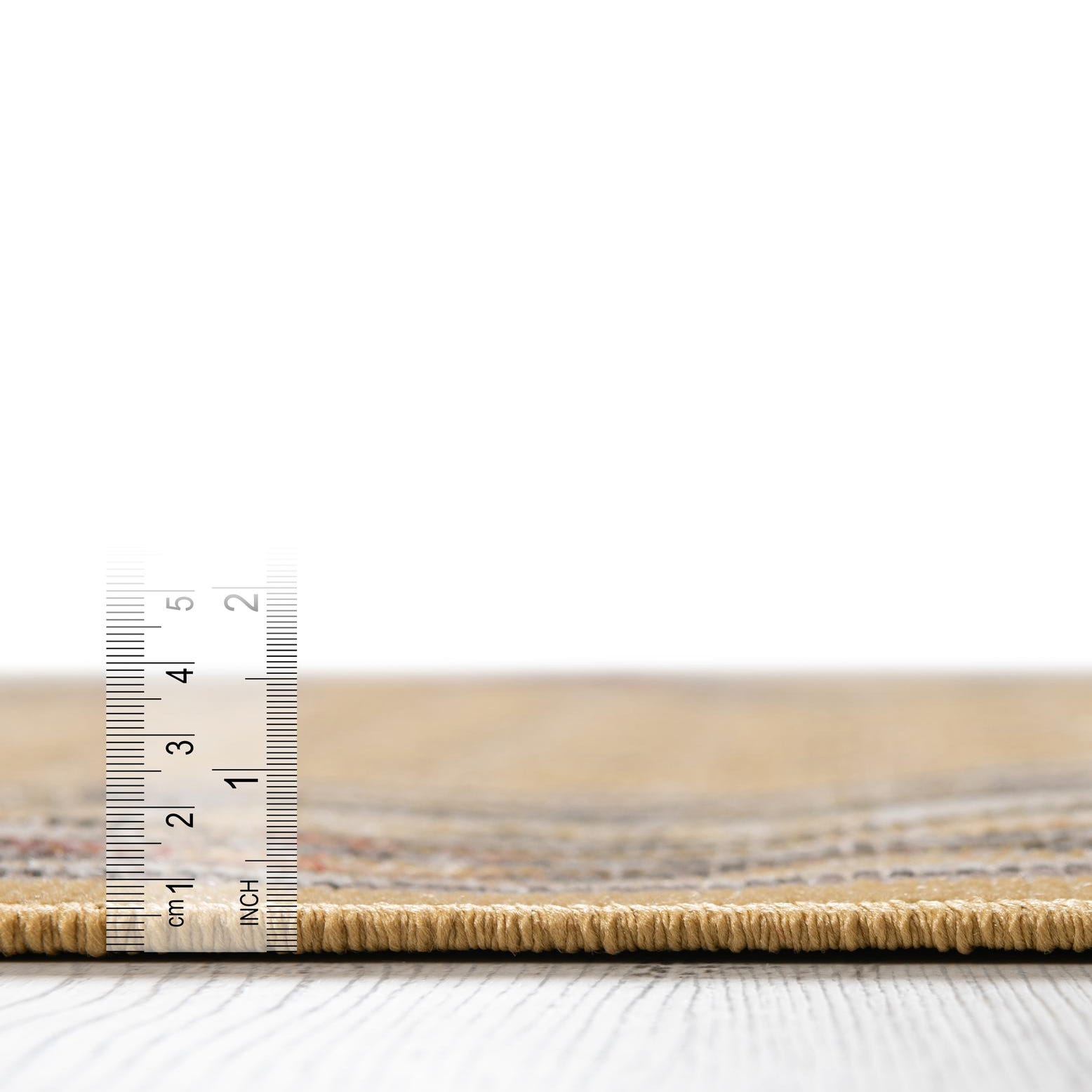 A decorative border frames the central area with intricate detailing in coordinating colors, adding visual interest and a sense of tradition. The texture of the rug is smooth, providing a comfortable surface underfoot. Adding a touch of elegance, the rug is finished with braided fringe on the shorter ends. Being stain-resistant and shed-free, this piece is both practical and stylish.