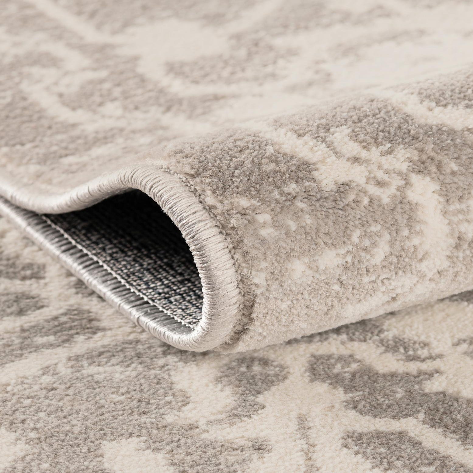 A soft, low-profile pile carries a traditional medallion and floral vine motif in ivory against a light gray ground, giving the rug a refined, gently aged look. The detailed border frames the central pattern with repeating floral elements and scrolling vines, while the slightly distressed finish adds depth and visual texture. Machine-made construction in 70% polypropylene and 30% polyester produces an even surface with a subtle sheen and a comfortable hand underfoot.