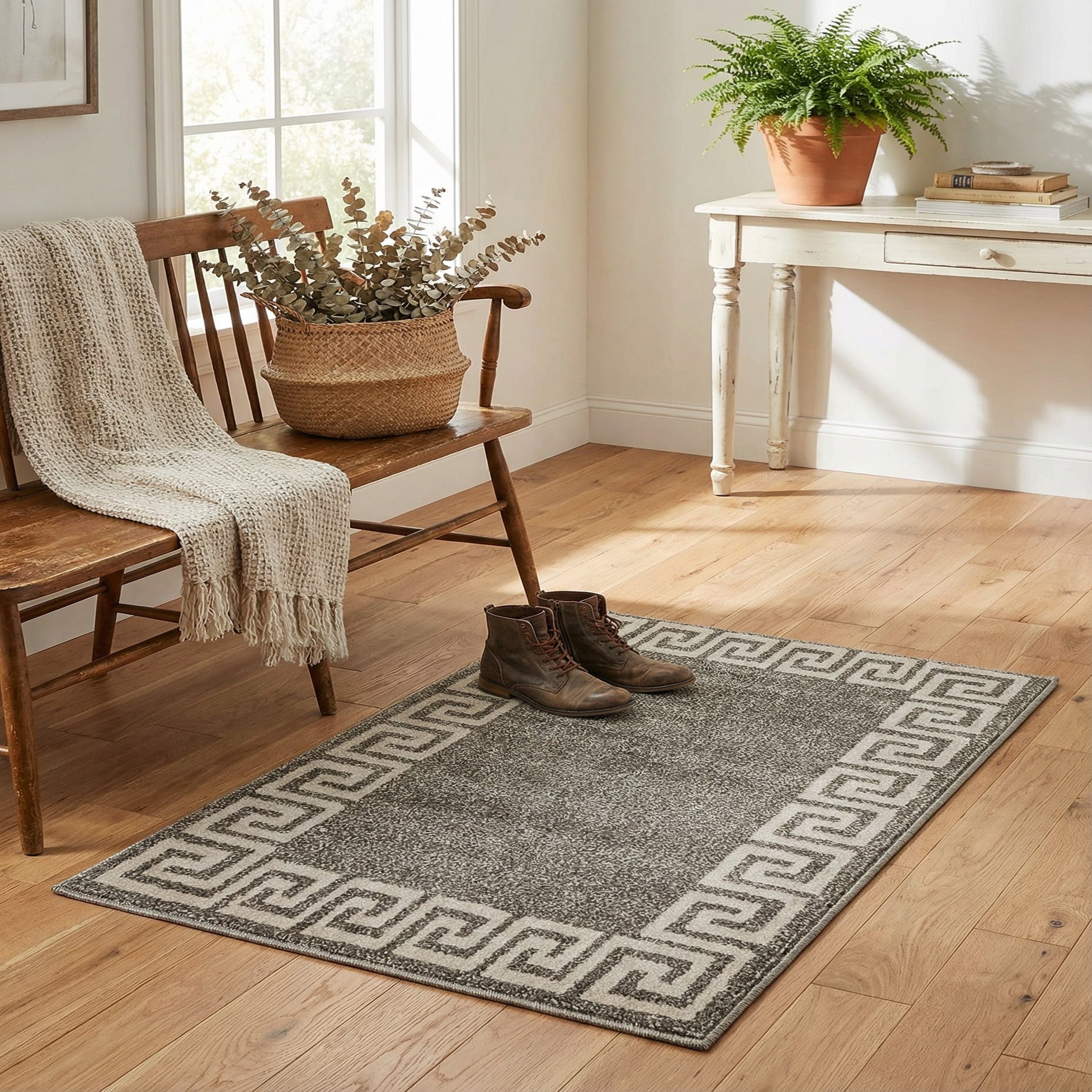 Ideal for small spaces and transitional interiors, this rug works well in a foyer, hallway, bathroom, or layered in front of seating to define a conversation area. Pair it with light or medium wood furniture and black metal accents for a contemporary look, or combine it with linen upholstery and brass details for a softer, more refined atmosphere. The Greek key border adds structure, making the rug a versatile anchor for both modern and traditionally inspired decor.