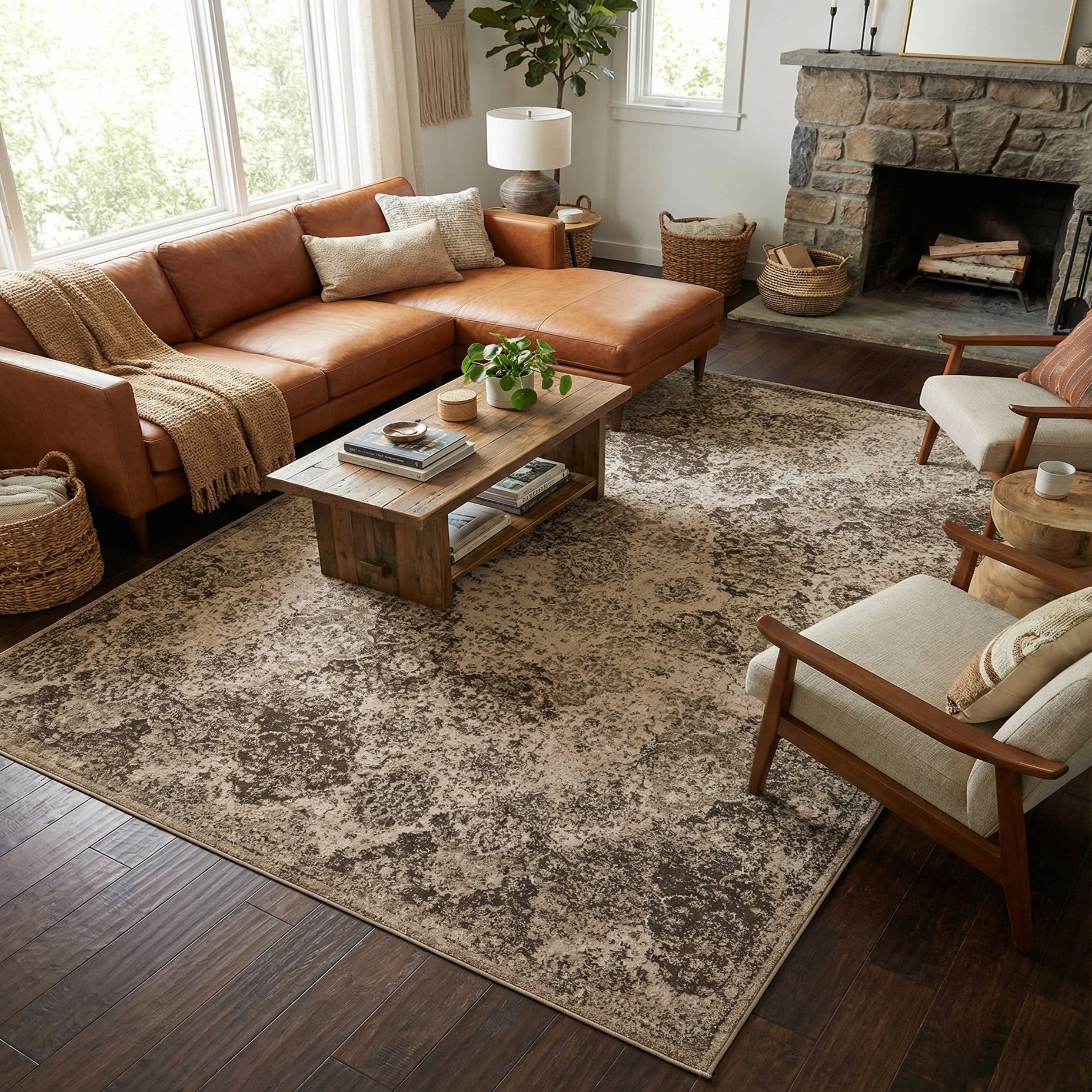 This piece works well anchoring a living area beneath a neutral sofa and wood coffee table, or beneath a dining table where its muted palette complements warm wood tones and leather seating. It also pairs nicely with a gray upholstered bed and green or tan throw pillows for a calm bedroom scheme, or in a casual, transitional space layered with textured linens and indoor plants for added warmth.