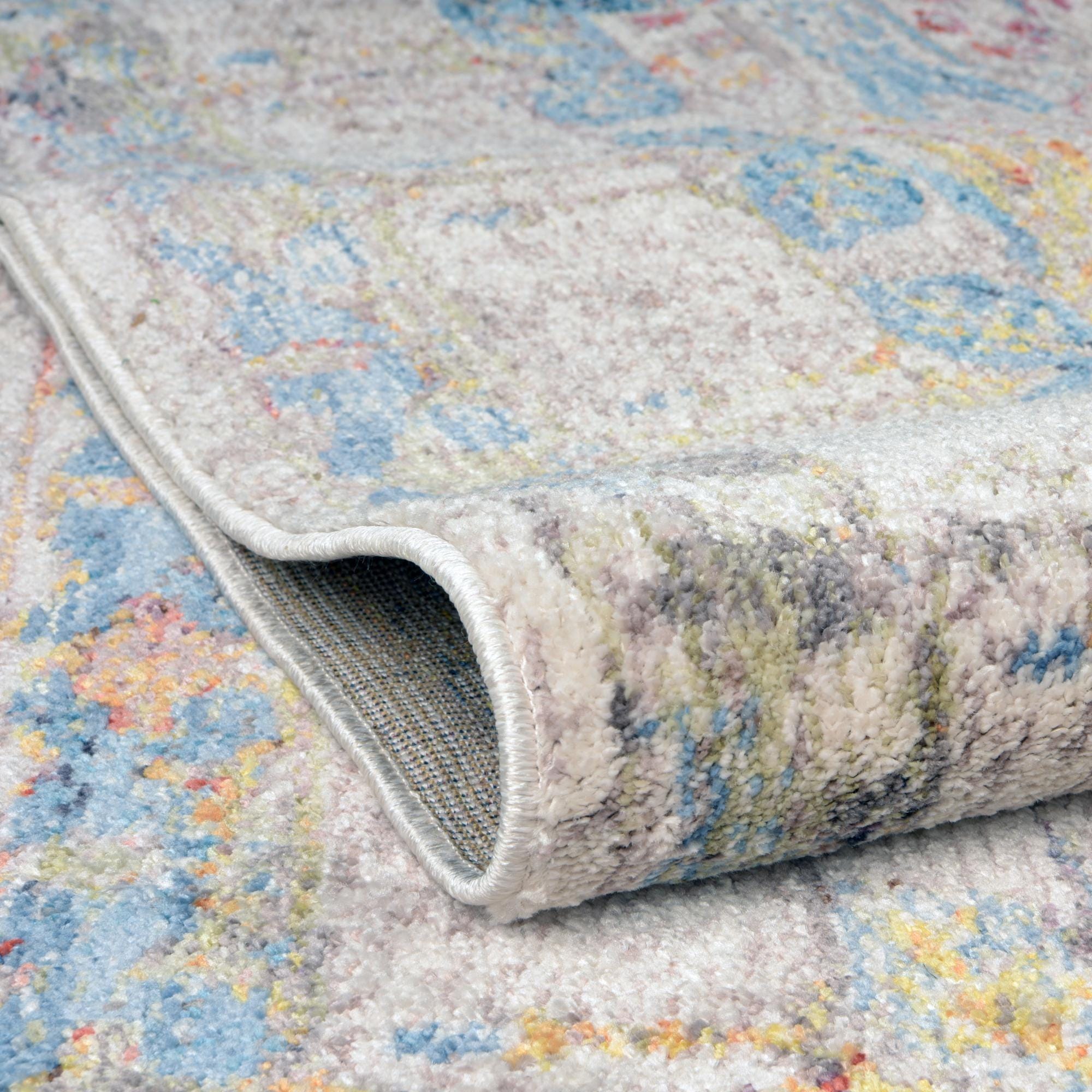 A softly distressed, vintage-inspired runner that layers painterly color across a neutral field. A central, faded medallion and subtle border are rendered in a washed, antique motif—not sharply defined but gently blurred—so the overall effect feels lived-in and relaxed. The background is multi with warm beige and gray undertones, while space-dyed polyester yarn introduces lively accents of blue, red, orange, gold, brown and black for depth and interest. Machine-made construction and the 100% polyester pile offer a low-profile, slightly plush texture with a soft hand and a light, subtle sheen.