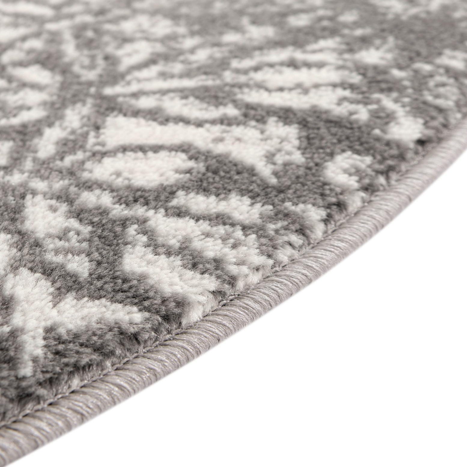 The neutral gray-and-ivory palette works easily with both warm wood furniture and cool metal or glass accents, making it a solid choice for transitional and modern-traditional interiors. Place it under a round dining table to define the area, center it in a living room seating group to anchor sofas and chairs, or use it in a bedroom to soften a reading nook. The machine-made construction keeps the pattern consistent and makes layering with other textiles straightforward.