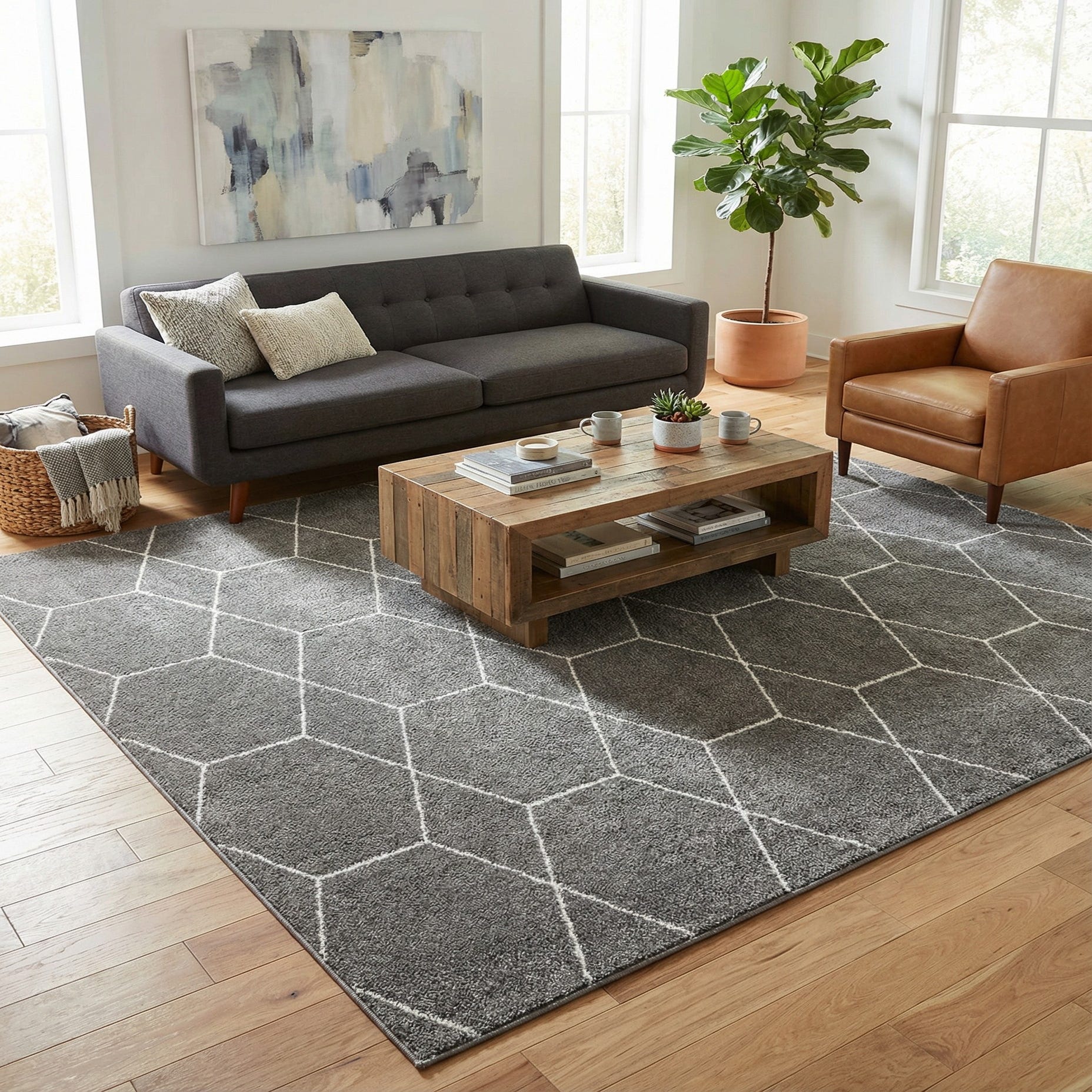 This rug works well as an anchor in a living room beneath a sectional or sofa, layered at the foot of a bed to add subtle pattern to a neutral bedroom, or placed under a dining table in a contemporary dining area. It pairs naturally with light- or medium-toned wood furniture, metal accents, and simple textiles, and complements both minimalist and transitional interiors that favor calm, tonal palettes.