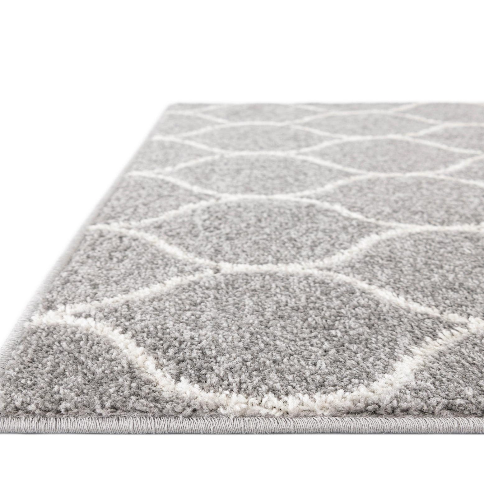An octagonal rug with a light gray background and an ivory arabesque lattice pattern, this piece balances geometric interest with soft texture. The curved trellis design is rendered in a slightly higher pile, creating a subtle raised effect against the lower-cut gray field. Machine-made from 100% polypropylene, the surface has a plush, even feel that layers well underfoot and pairs easily with a variety of finishes.