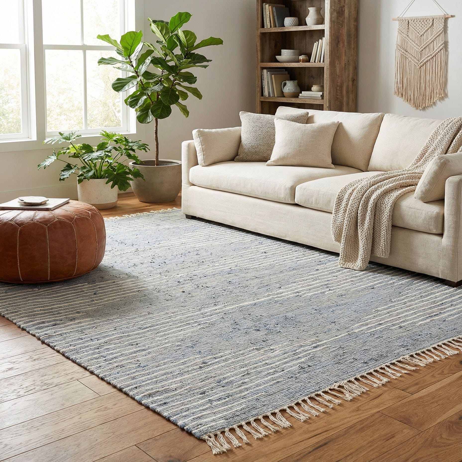 The cotton weave feels soft and breathable underfoot, with slightly raised white yarns that add a gentle tactile contrast to the smoother gray field. Its muted palette and clean lines work well with light wood or painted furniture, linen upholstery, and navy or denim accents. Place it to anchor a relaxed living room seating area, layer it under a coffee table for added texture, or use it in a bedroom to support coastal, Scandinavian, or modern farmhouse interiors.