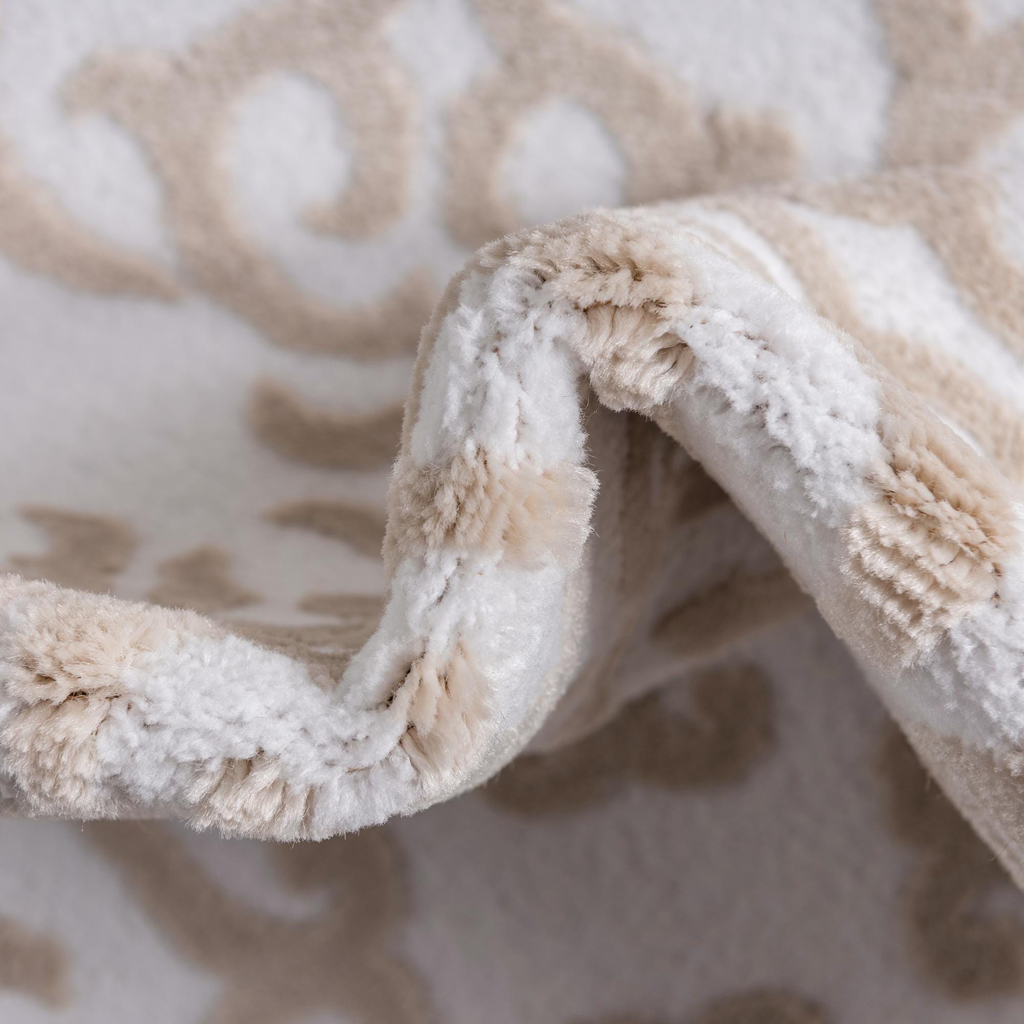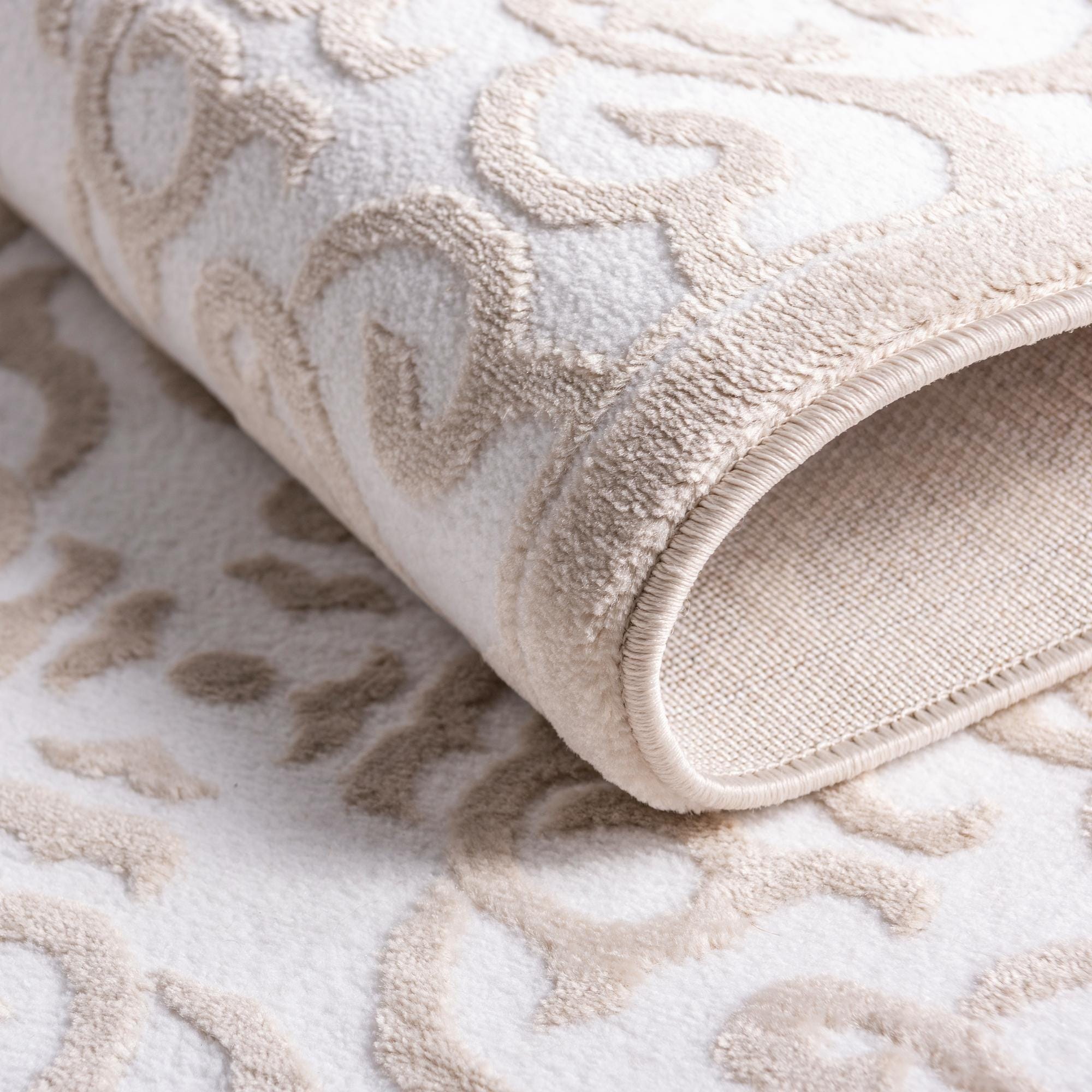 A soft, round area rug with a delicate scrollwork motif in warm Beige set against a Snow White background. The raised beige pattern creates a subtle, sculpted texture you can feel underfoot while the low-profile pile keeps the overall look refined and uncluttered. Machine made from 55% polypropylene and 45% polyester, the construction gives the rug a smooth, slightly velvety hand and a consistent pattern definition across the surface.