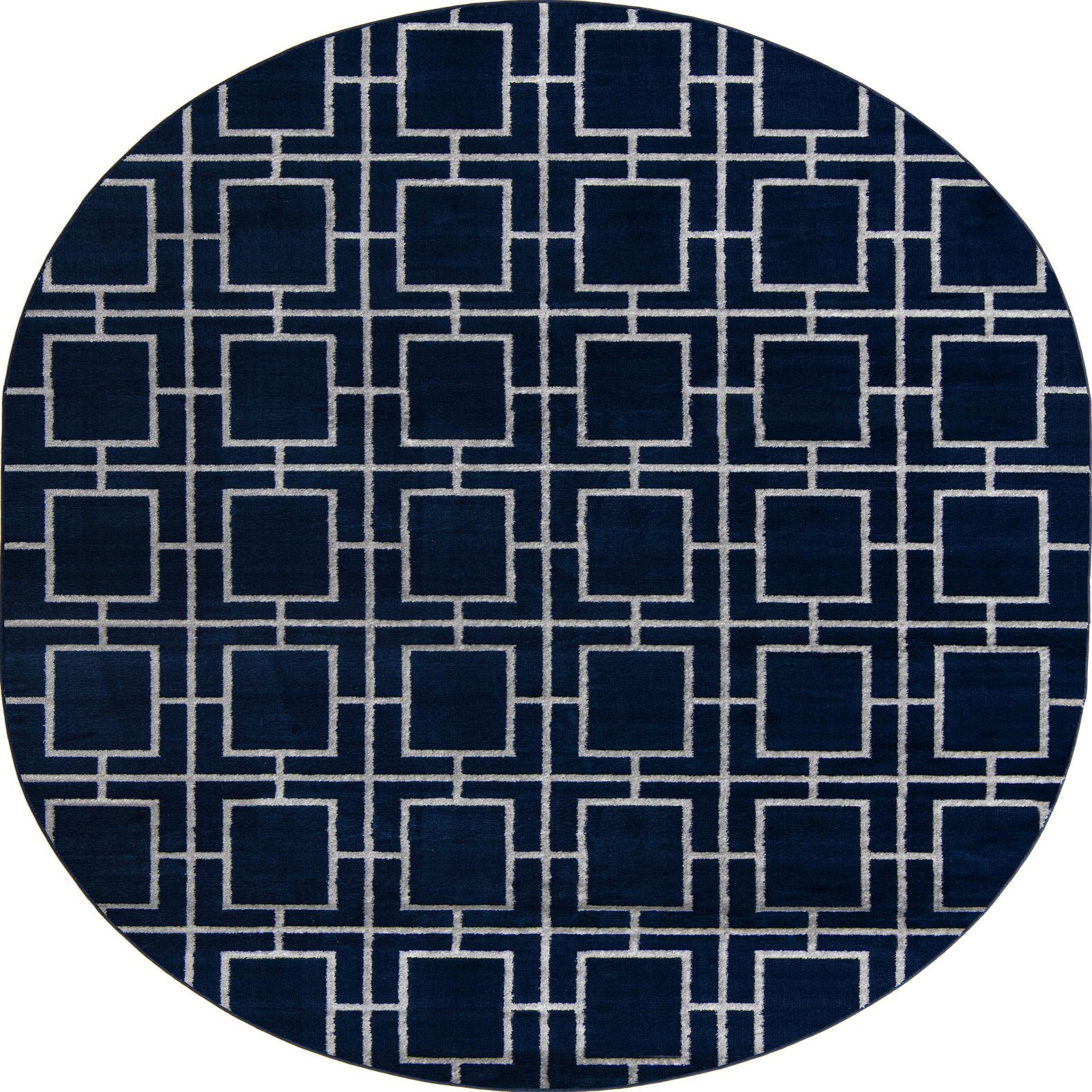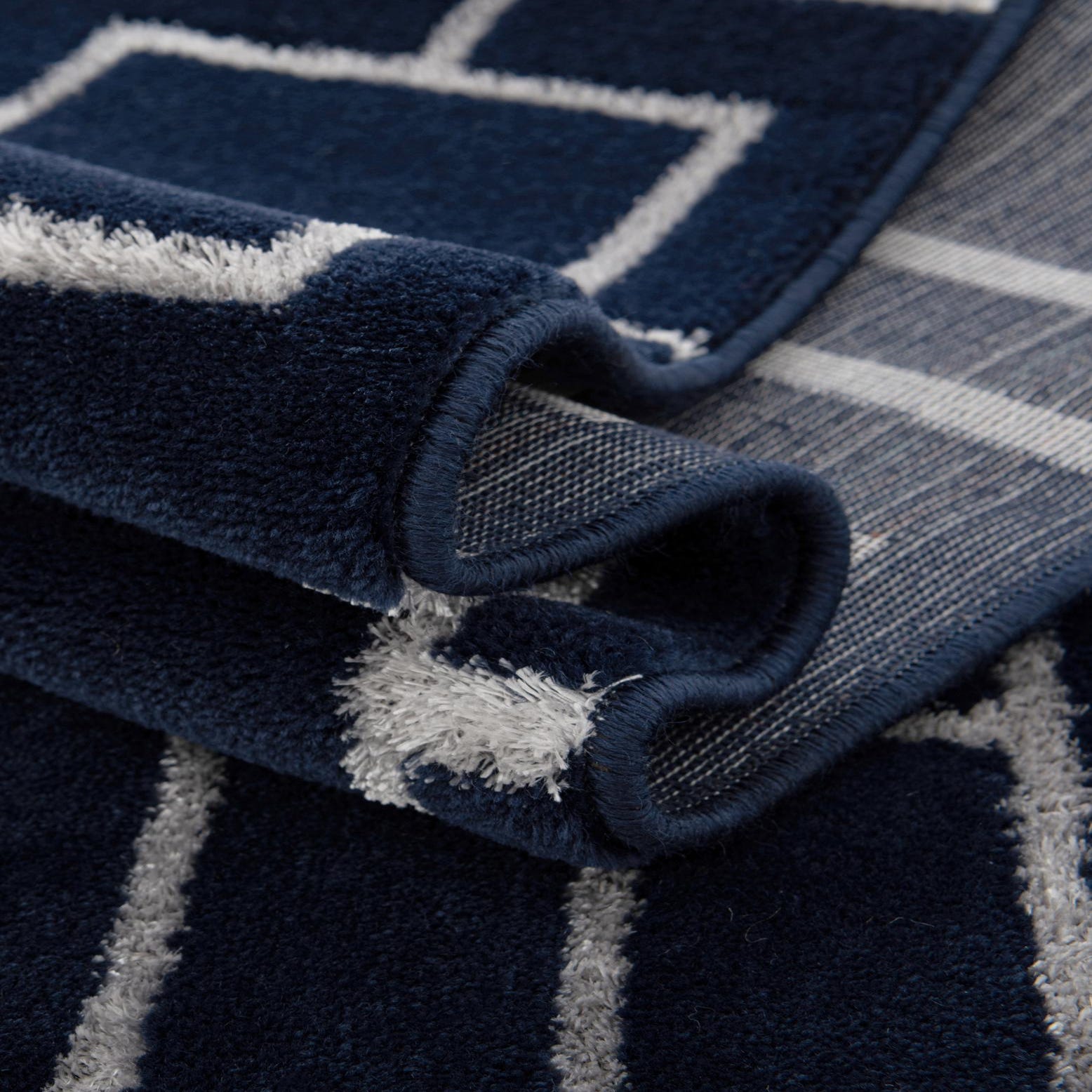 A navy-blue silver ground sets a deep, elegant base for a crisp silver trellis motif on this oval area rug. The geometric pattern of stacked squares and intersecting lines gives the rug a modern, architectural look while the machine-made construction—70% polypropylene and 30% polyester—delivers a soft, low-profile hand with a subtle sheen where the silver fibers catch the light. The contrasting fibers create a gentle dimensional effect underfoot, so the pattern reads clearly without adding bulk.