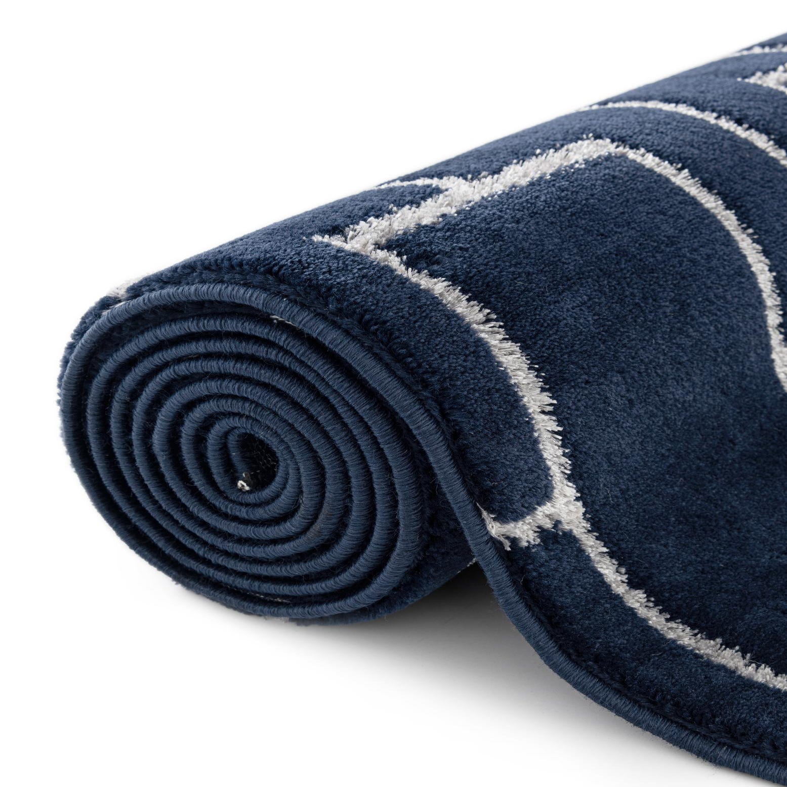 This piece works well as an anchor for a contemporary living room seating group, beneath an oval or round dining table to soften angular furniture, or layered at the foot of a bed in a bedroom palette that leans on navy and metallics. Pair it with neutral upholstery, chrome or silver accents, and warm wood tones for balance; it also complements mid-century modern, transitional glam, or coastal-inspired interiors that use deep blues and metallic highlights.