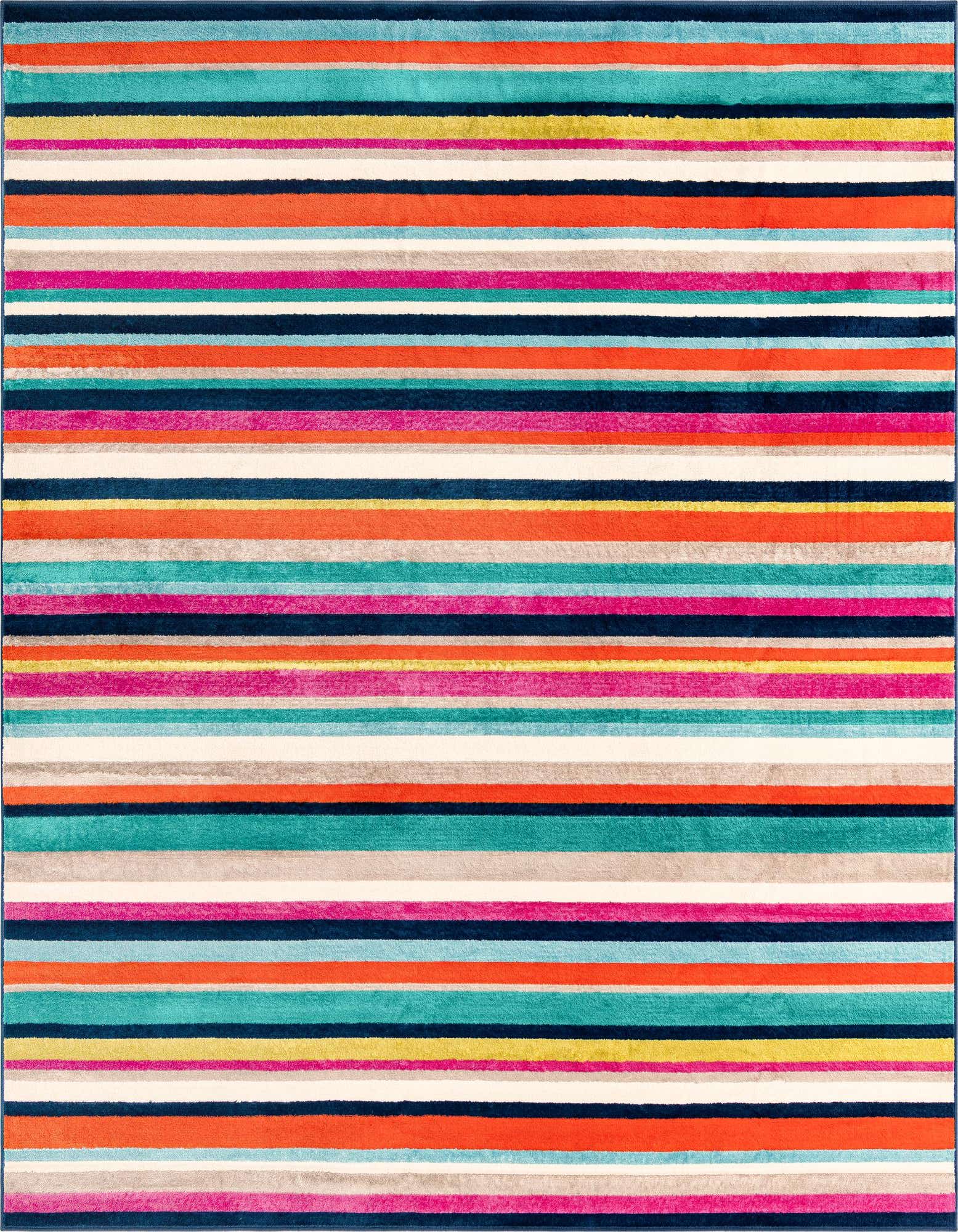 Designed to infuse energy and color into a room, this rug is well-suited for contemporary, eclectic, or modern interiors. It can serve as a statement piece in a minimalist setting or blend harmoniously with a more vibrant decor. Place this rug in a living room, bedroom, or playroom to add a splash of color and pattern. Its multicolored stripes can complement various color schemes while providing a playful and inviting atmosphere.