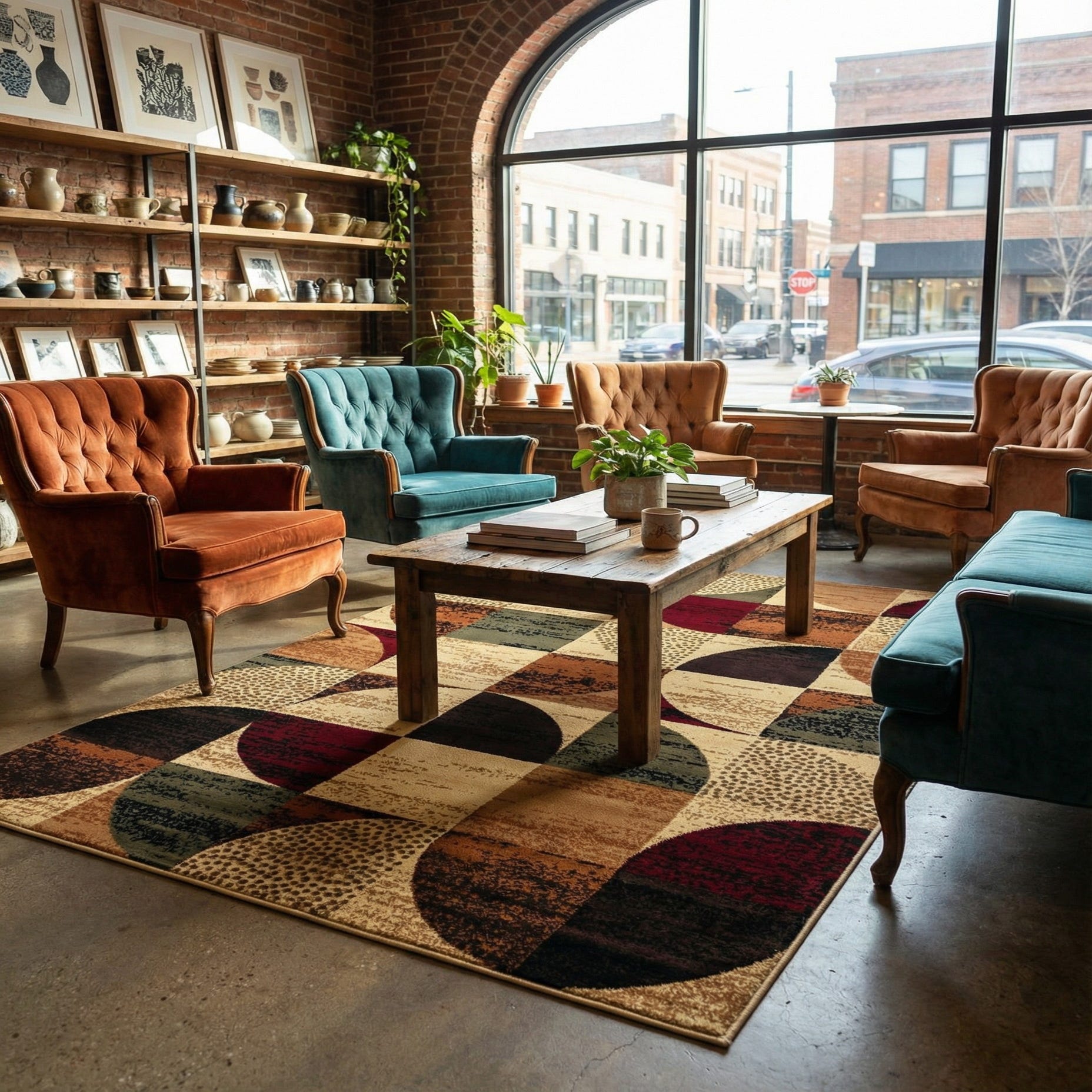This rug works well in contemporary and transitional settings: place it to anchor a seating area beneath a coffee table, add warmth to a home office under a desk, or define a casual dining spot for a smaller table. Pair it with warm wood tones, leather or neutral upholstery, and metal or wood accents to complement the pattern’s mid-century-modern energy while keeping the room grounded.