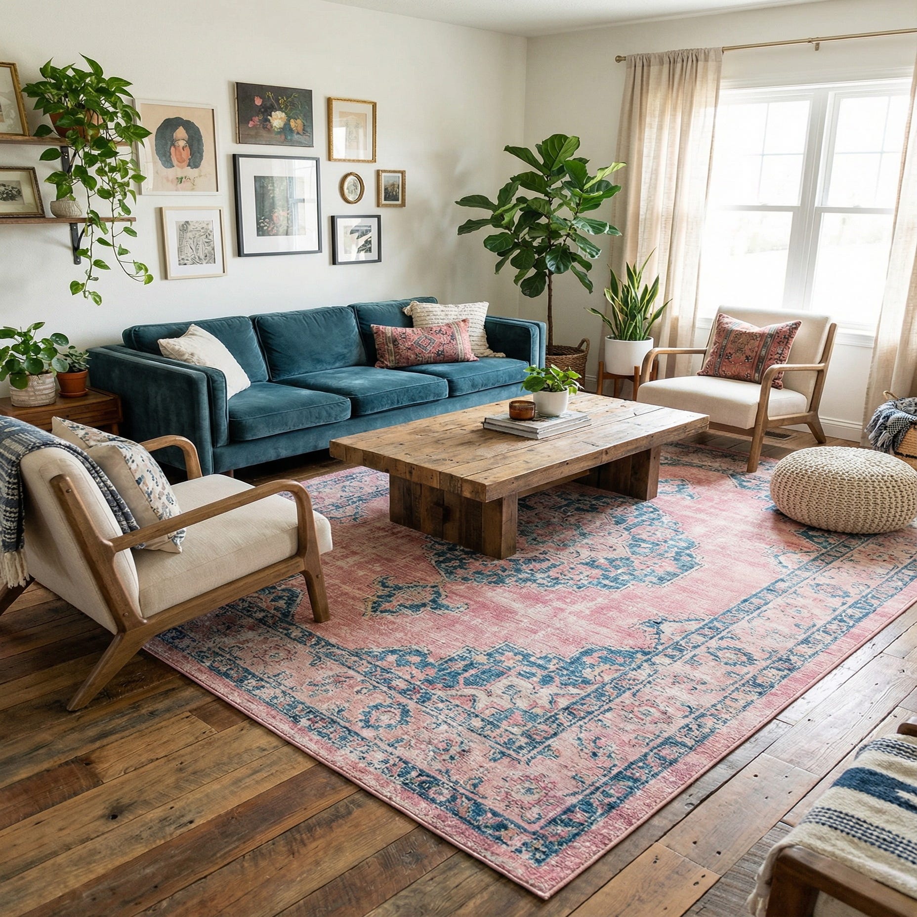 This rug works well in living rooms paired with neutral sofas and navy or brass accents, in bedrooms layered under the bed to introduce color and warmth, or in a casual dining area where its vintage-inspired pattern can complement wood or painted furniture. It also fits nicely in eclectic or coastal schemes—pair with whitewashed finishes, textured linens, and mixed-metal accessories for a cohesive look.