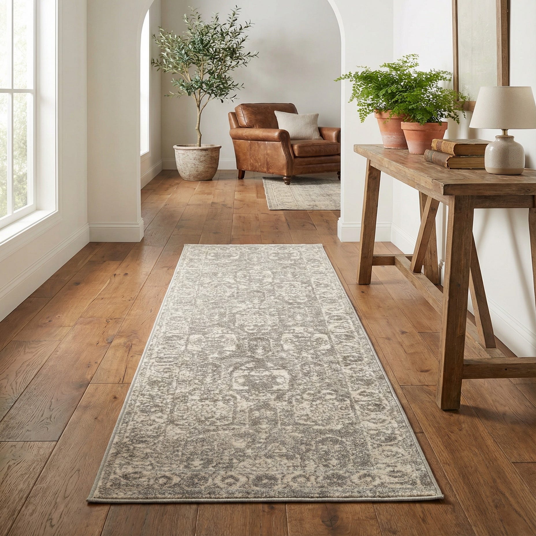 This runner works well in hallways, narrow entryways, or alongside a galley kitchen, where it can introduce pattern without overwhelming the space. It pairs naturally with light wood floors and mixed metal accents, and complements transitional, modern-traditional, or minimalist interiors that favor soft neutrals. Use it to anchor a console table, line a corridor, or layer in front of a sofa for subtle pattern and understated warmth.