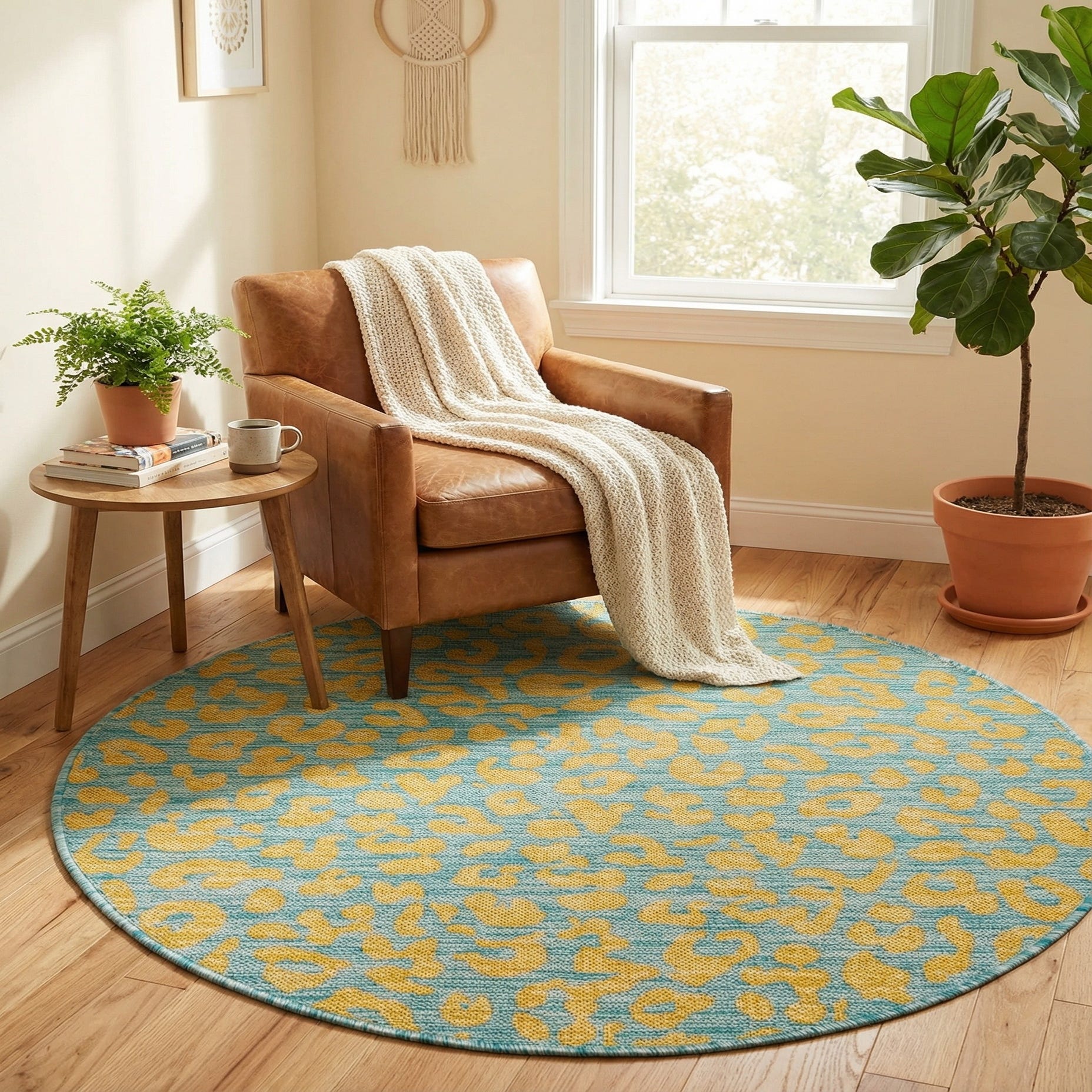 A 4' round blue and yellow modern rug with a leopard print pattern, suitable for indoor or outdoor use.