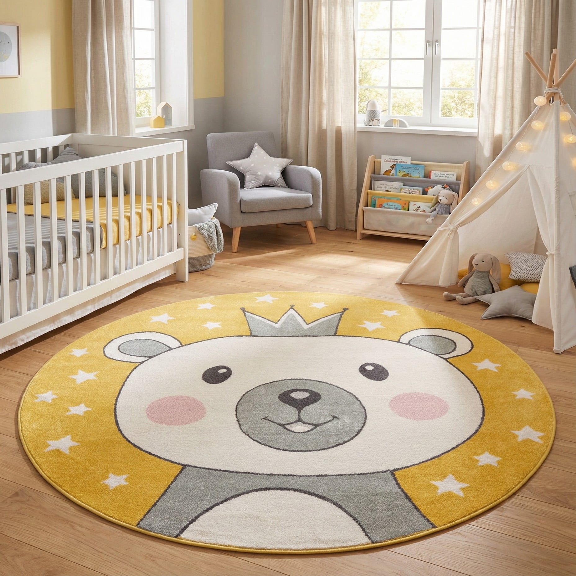 A playful round rug with a sunny yellow field that frames a large, friendly bear face wearing a gray crown. The bear’s ivory face and gray muzzle are defined by soft black outlines, while rosy pink cheeks and simple black eyes give the design a gentle, approachable expression. Scattered ivory stars around the perimeter add whimsical movement and visual interest against the vibrant yellow background. Machine-made from 100% polypropylene, the rug has a low, plush pile that feels soft underfoot and holds the design’s clear lines and color contrasts.