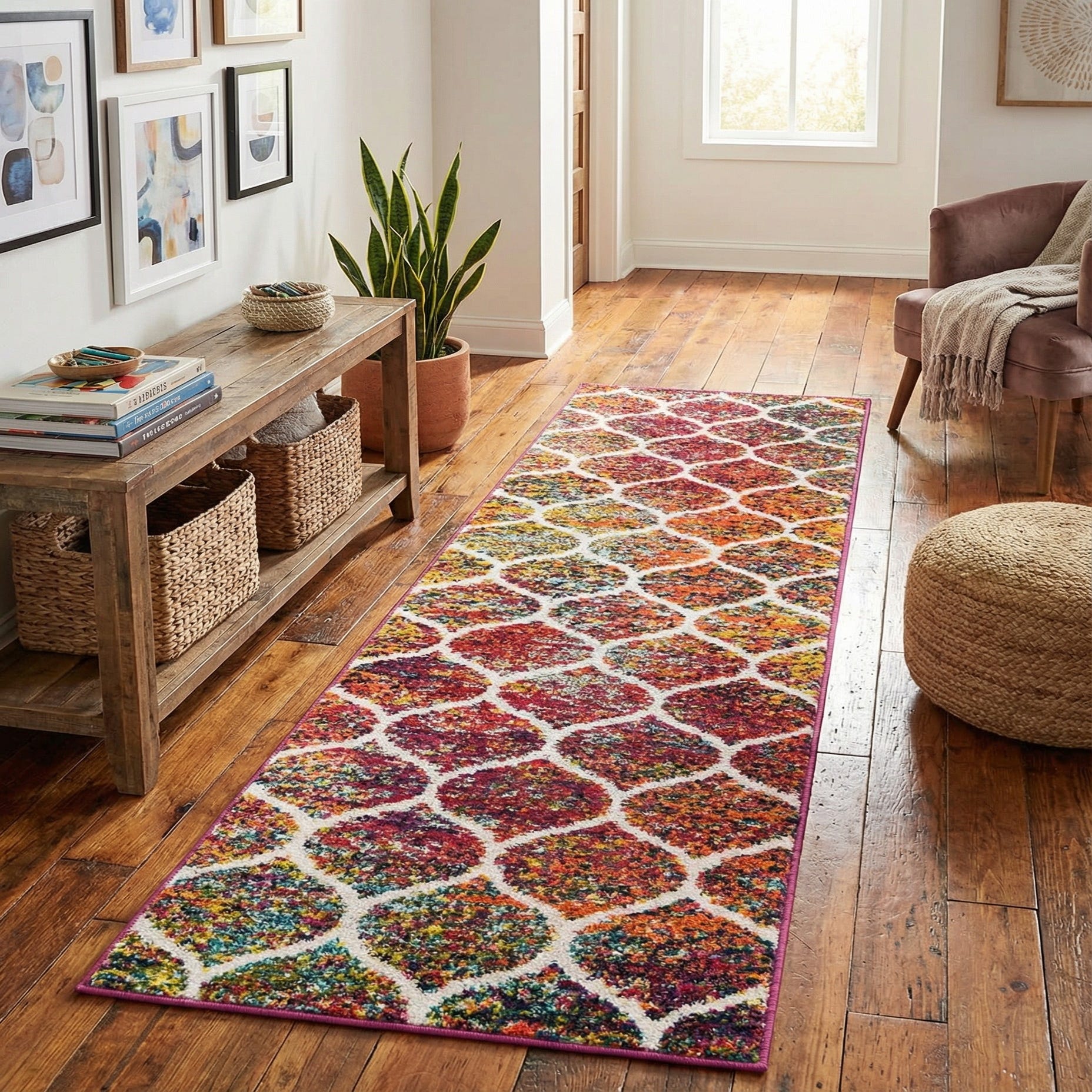 This runner is ideal for adding color and pattern to narrow spaces—think hallways, entryways, and alongside beds—but also works well layered in living rooms or behind sofas to define traffic lanes. Pair it with neutral upholstery to let the rug be the focal point, or coordinate with eclectic, bohemian, or contemporary interiors where rich color and tactile texture enhance the overall palette.