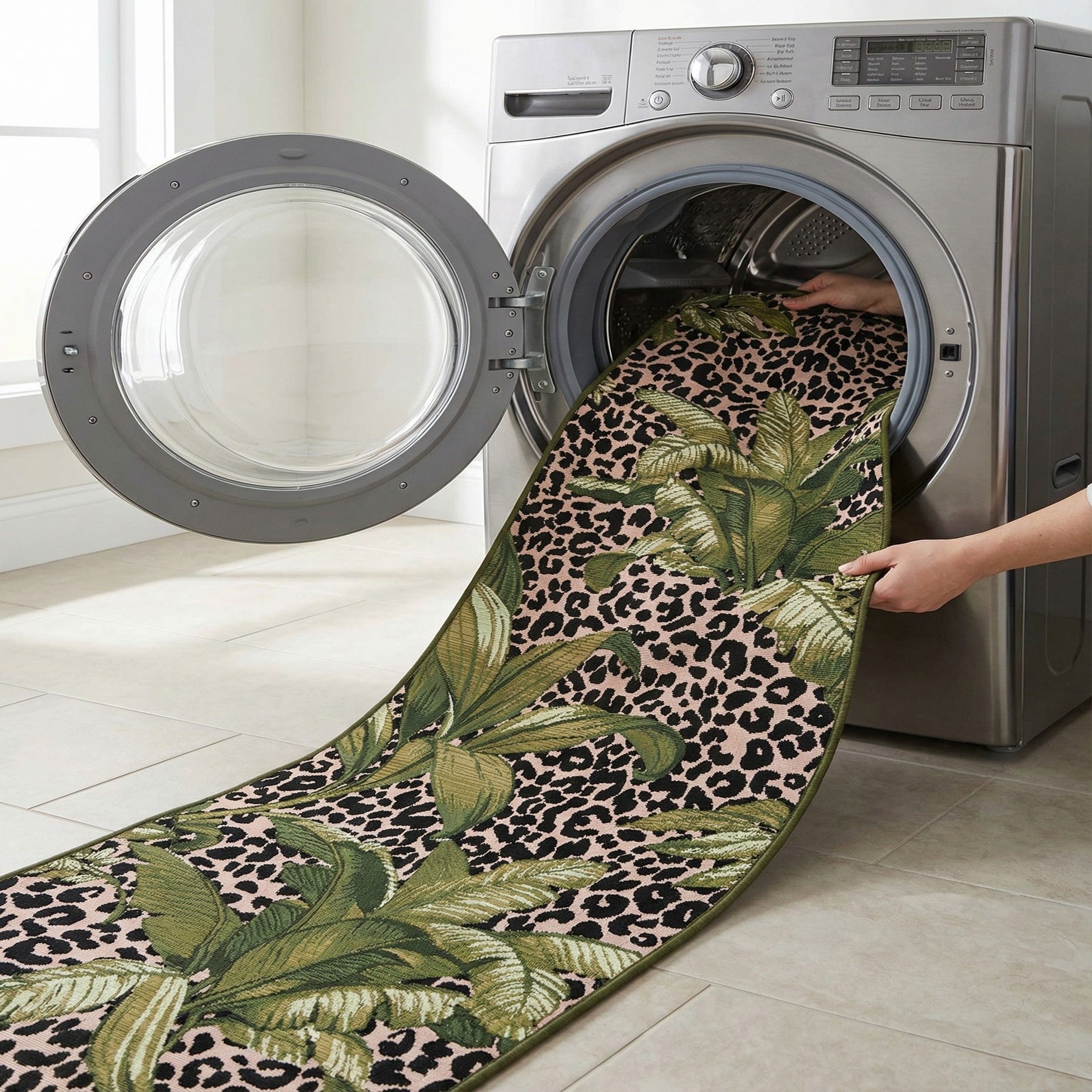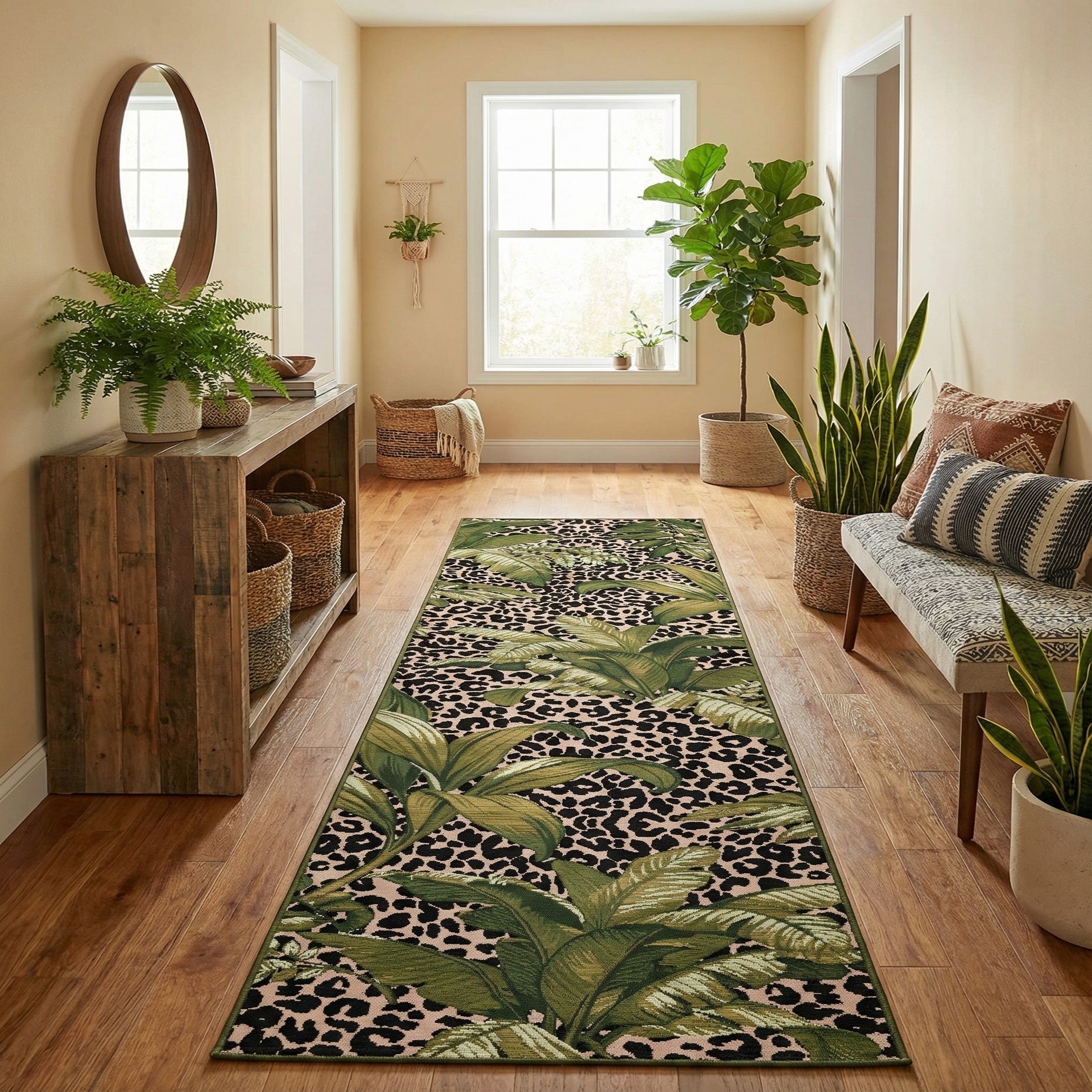 A long runner rug featuring a bold pattern of green tropical leaves over a pink and black leopard print background.