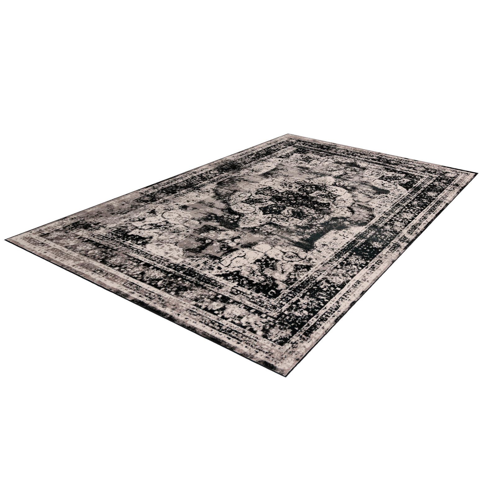 Primary color is Black. Colors in this rug include: Black, Ivory, Gray.
