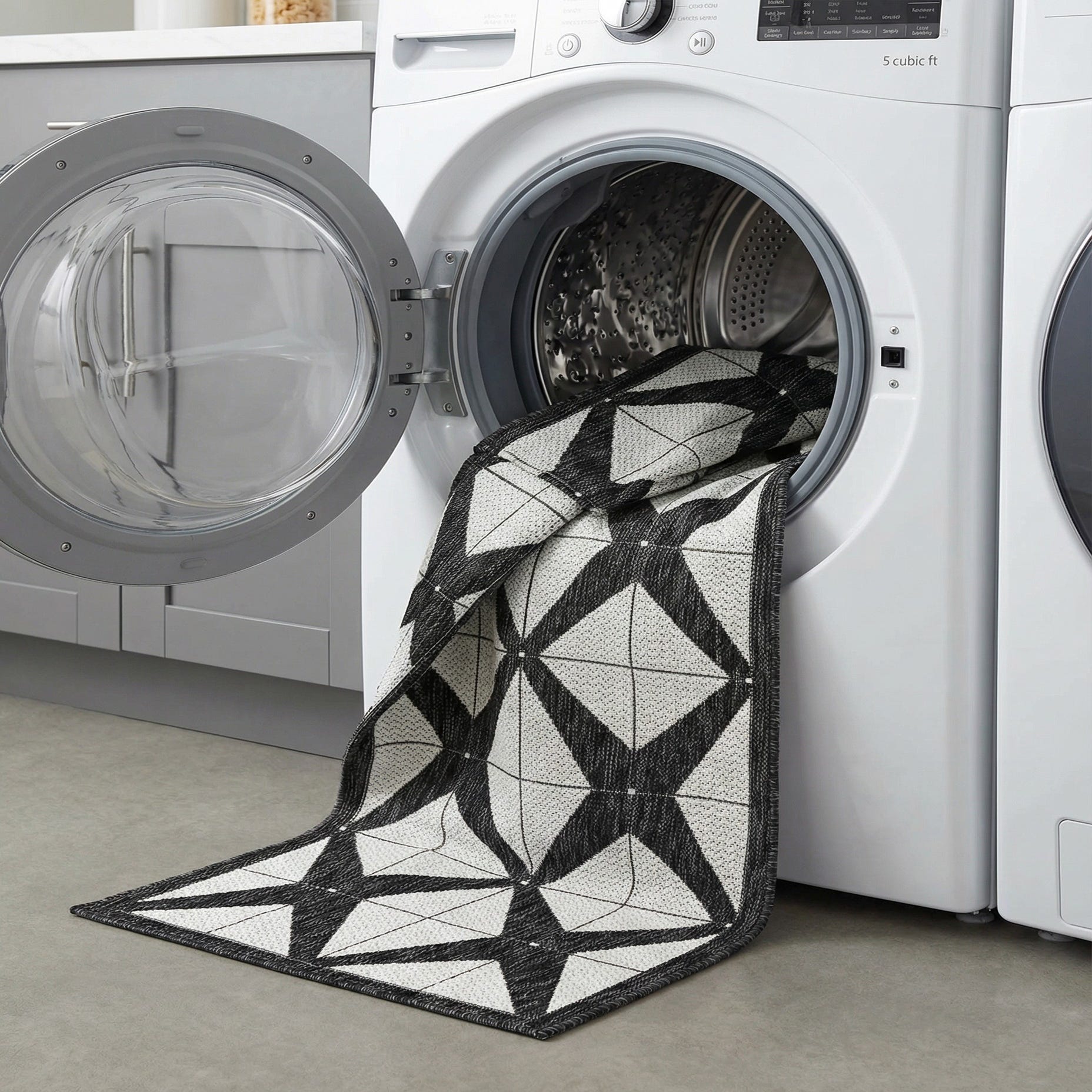 This runner is a smart choice for various decor situations, including entryways, outdoor patios, kitchens, and hallways. Its graphic design can serve as a focal point or complement minimalist and industrial interiors. Additionally, the black and white colors align well with an array of color schemes, making it easy to integrate into existing decors.