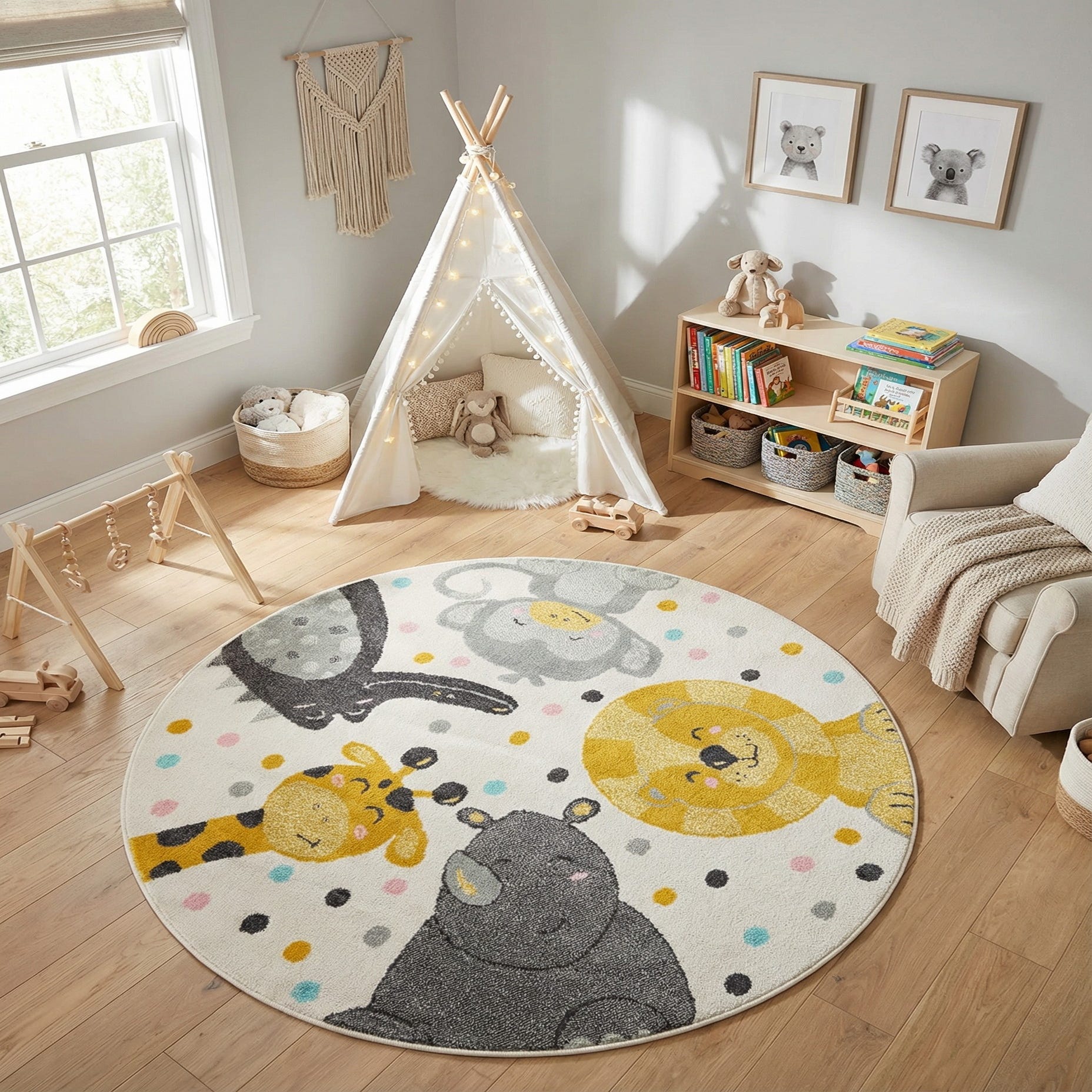 A round rug with an ivory ground patterned in playful animal portraits and confetti dots, this piece brings a light, cheerful look to a child's space. Smiling faces — a golden lion with a striped mane, a sunny giraffe with dark spots, a soft gray rhinoceros, a light-gray elephant and a dark-snouted crocodile — are rendered in yellow, blue, gray and black against the pale background. The scattered pastel dots add movement and a gentle pop of color, while the simple, illustrative style keeps the design modern and friendly.