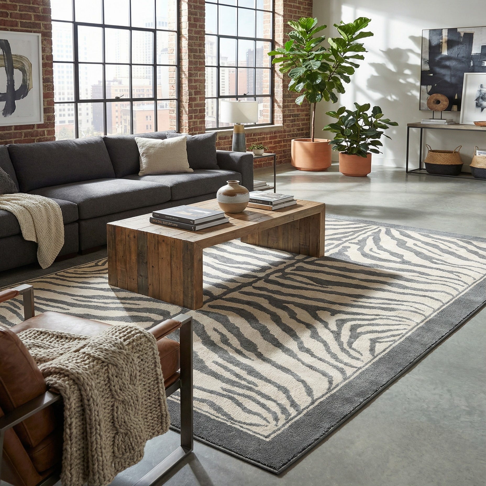 A modern, graphic take on an animal stripe motif, this rug features a mirrored central spine with organic, flowing stripes that radiate outward and settle into a thin inner border and a solid outer band. Rendered in gray and ivory, the ivory field provides a soft contrast to the cool gray pattern and frame. Machine-made from 100% polypropylene, the rug has a low-pile construction with a smooth, slightly cushioned surface that feels comfortable underfoot while keeping the pattern crisp and well-defined.