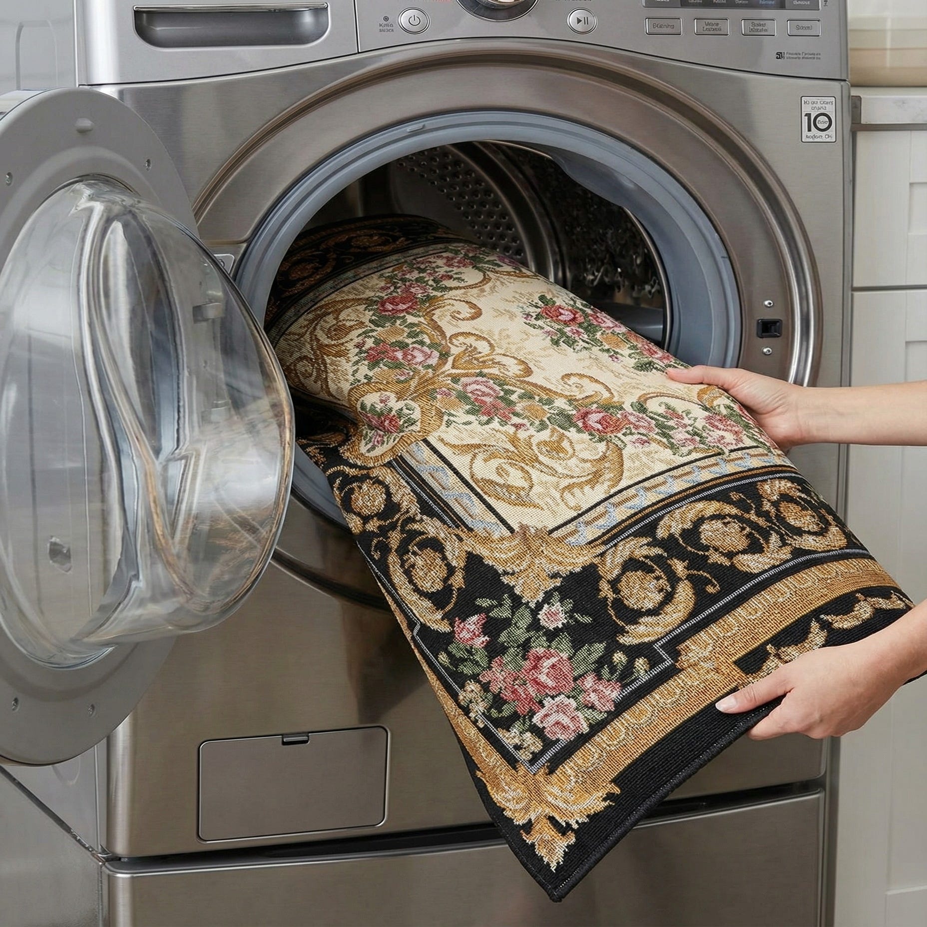 Place this rug in a covered patio or sunroom to bring a classic, garden-inspired look to outdoor living, or use it inside an entryway or small seating area to anchor furniture and add layered pattern. It pairs naturally with warm wood finishes, brass or antique metal accents, and upholstered pieces in neutral or jewel tones, and works well with traditional, French country, or transitional interiors where floral detail and rich contrast are desired.