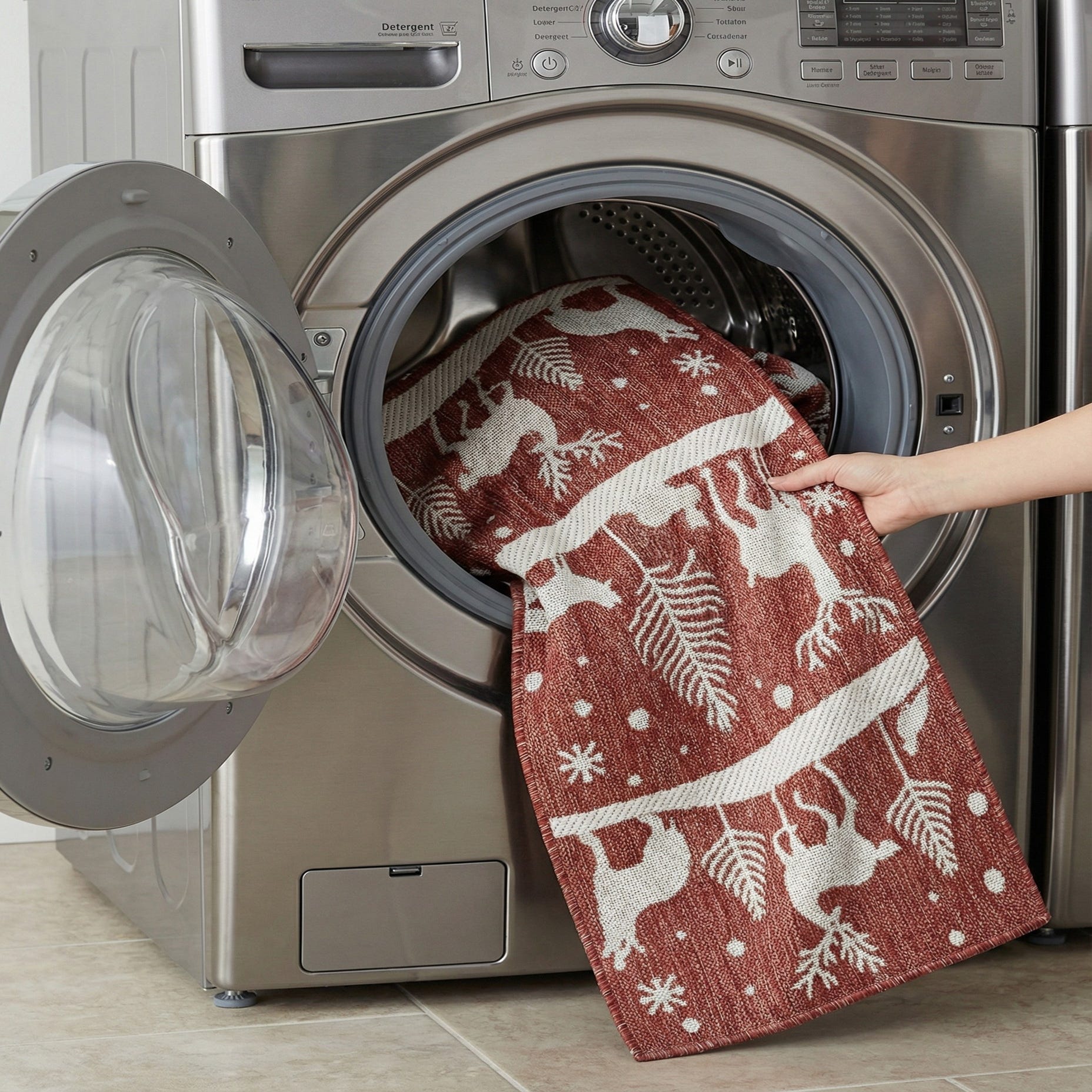 The contrasting colors are bold yet harmonious, providing visual appeal and thematic relevance for any space seeking a touch of winter festivities. Its stain-resistant nature ensures the rug maintains its appearance, making it a practical addition for homes with high foot traffic or pets. Moreover, its shed-free quality means less maintenance and more enjoyment over time.