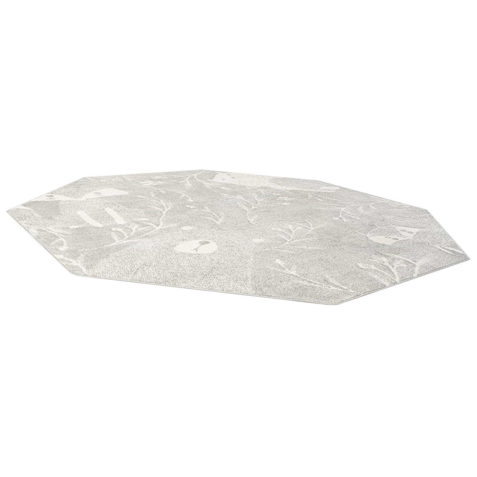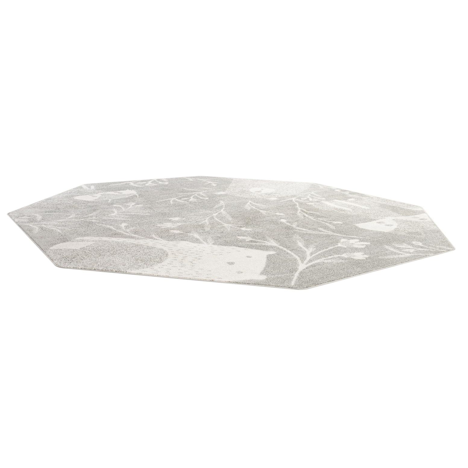 A gentle woodland scene unfolds across a soft gray background, with ivory silhouettes of a bear, fox, owl and raccoon tucked among delicate leafy sprigs. The octagonal shape adds a playful geometric edge while keeping the look calm and modern. Machine made from 100% polypropylene, the low-profile pile feels soft and slightly cushioned underfoot; the ivory motifs sit a touch higher than the ground color to create subtle texture and visual depth.