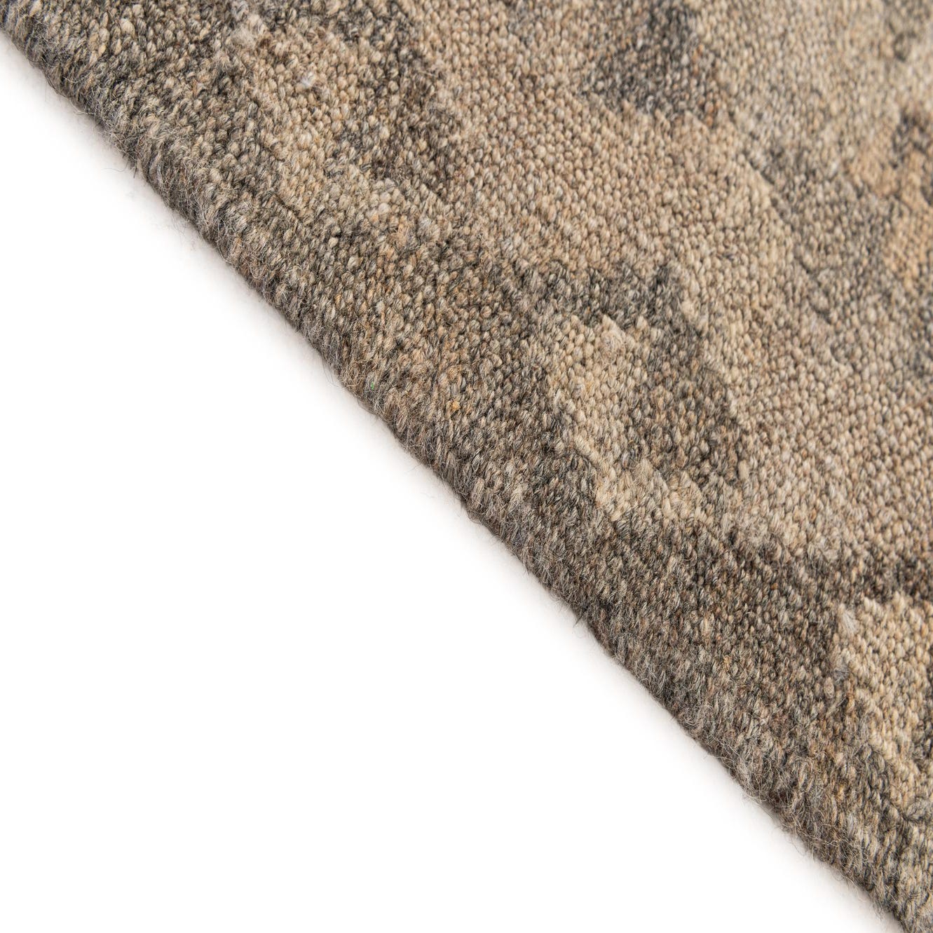 A 4x6 rectangular flatweave wool rug featuring a tribal geometric pattern in varying shades of brown and beige.