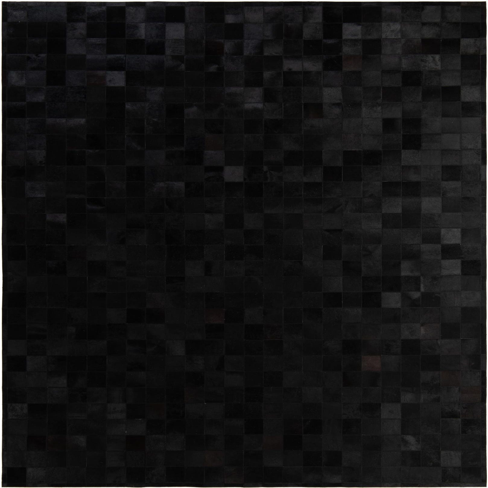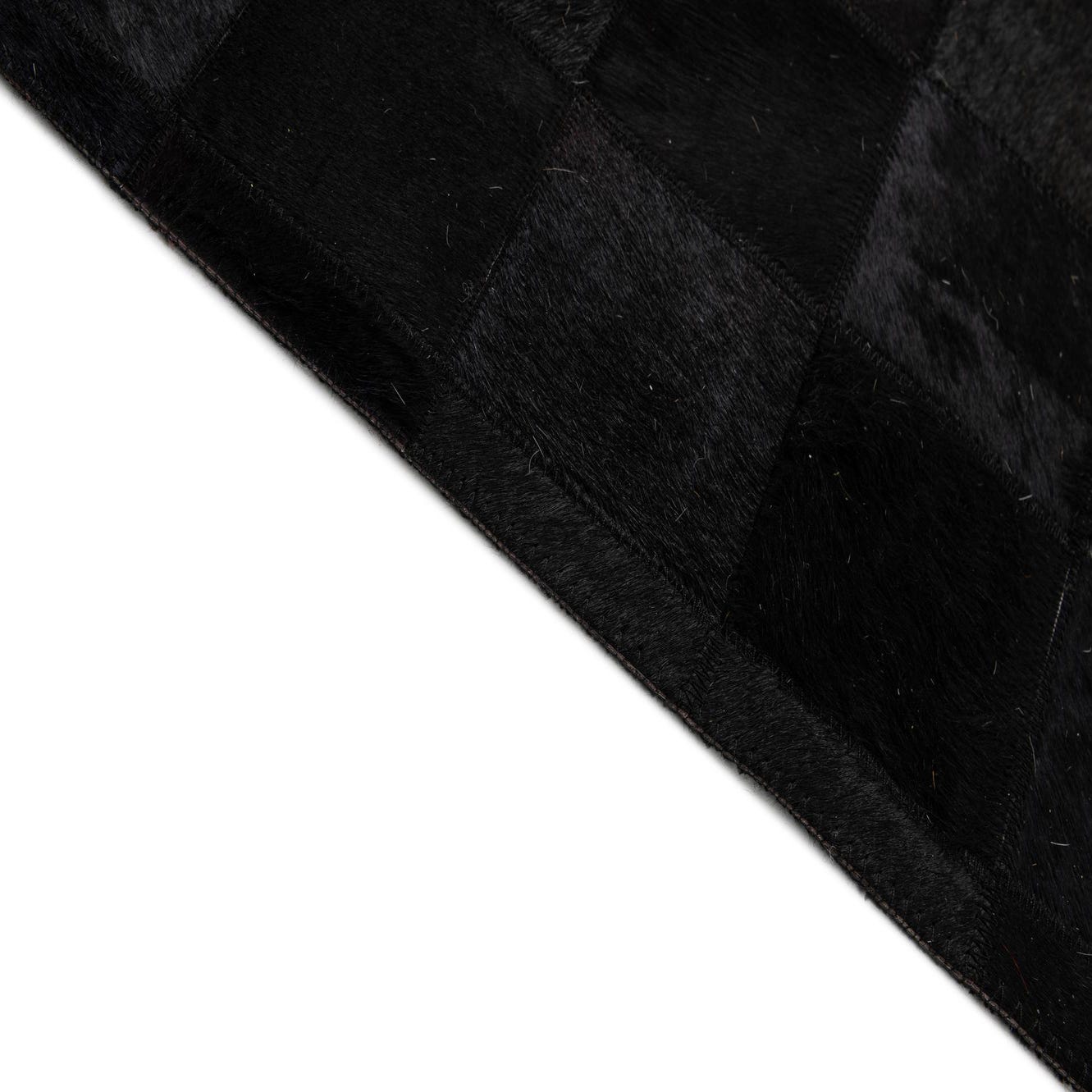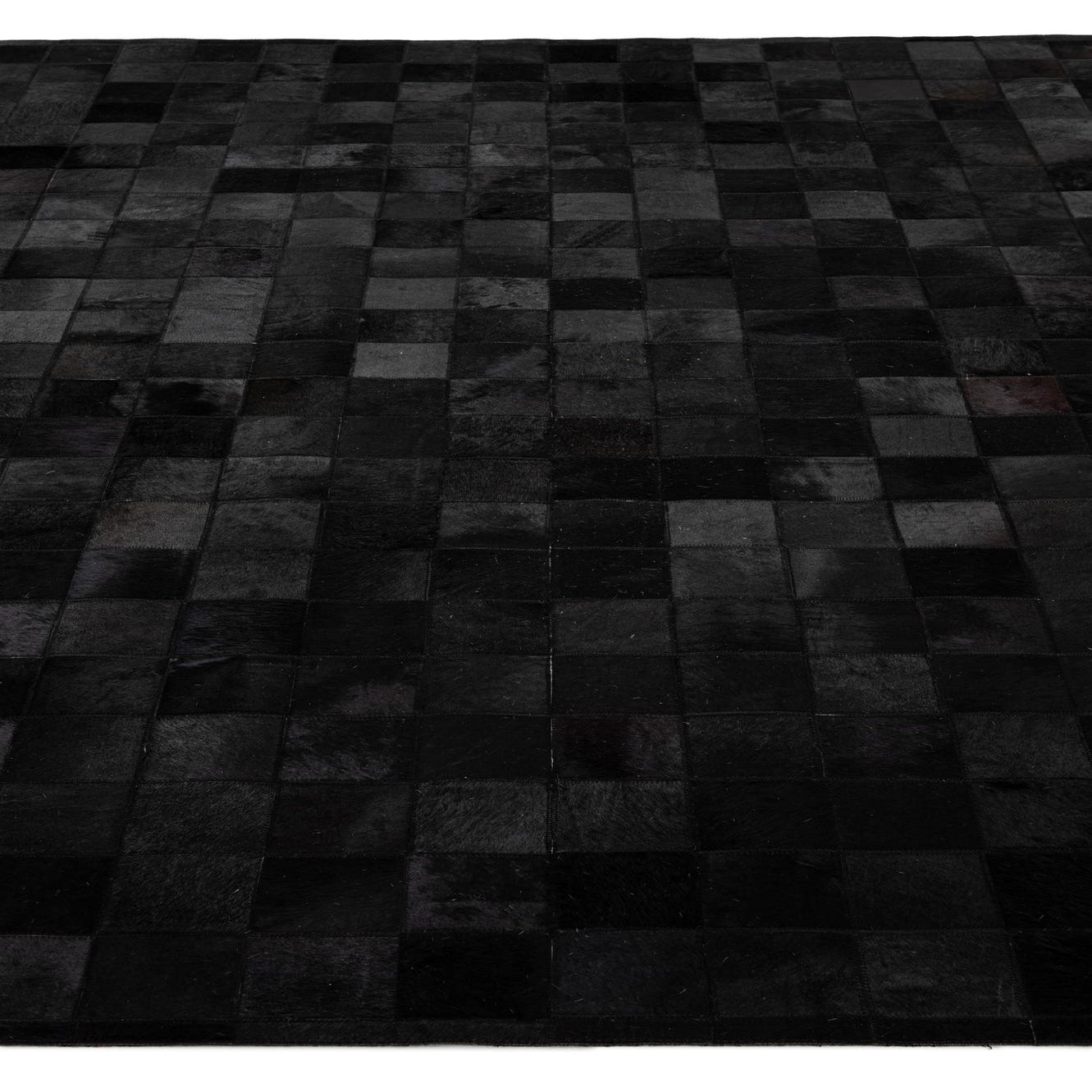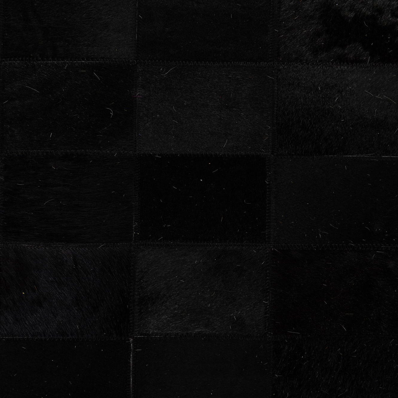A precise grid of hand-cut cowhide squares forms a minimalist patchwork pattern that reads clean and contemporary. Deep black and charcoal tones create subtle shifts in shade across the surface, while the natural hair-on-hide and leather backing give the piece a tactile, low-pile texture with a soft nap and a gentle, built-in sheen where the light catches the hair. Visible stitching between tiles adds an artisanal edge and a structured finish that highlights the handmade construction.