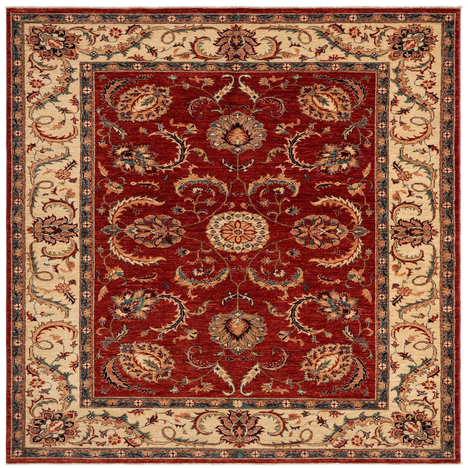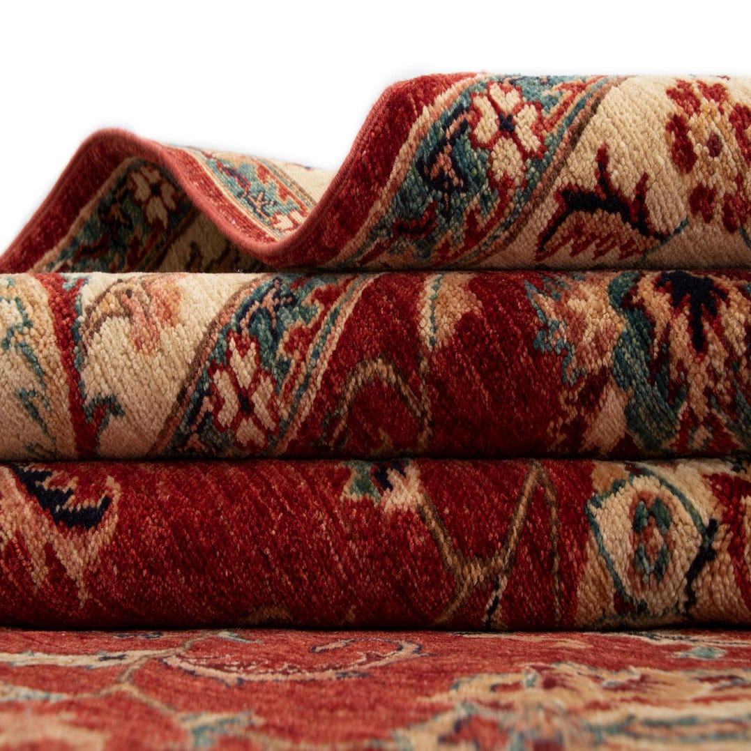 A 5x8 rectangular red Persian rug with an intricate floral and medallion pattern, featuring a wide cream border with complementary motifs.