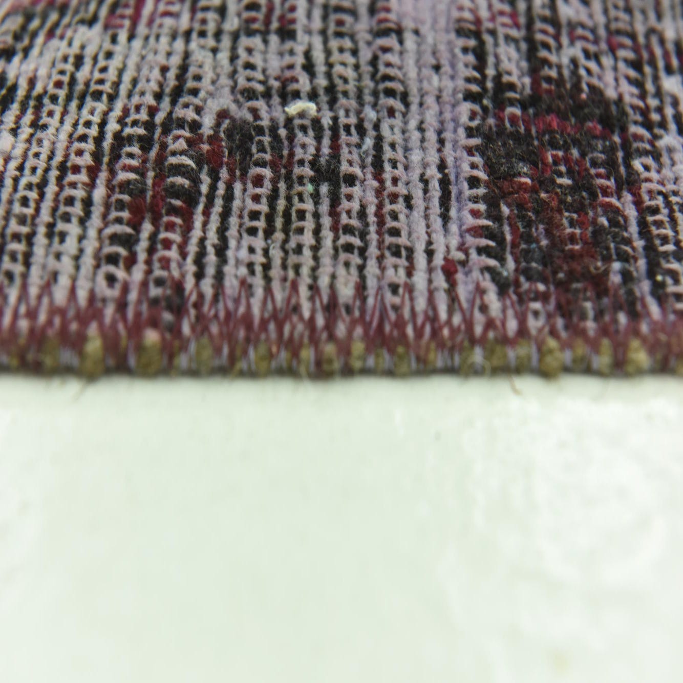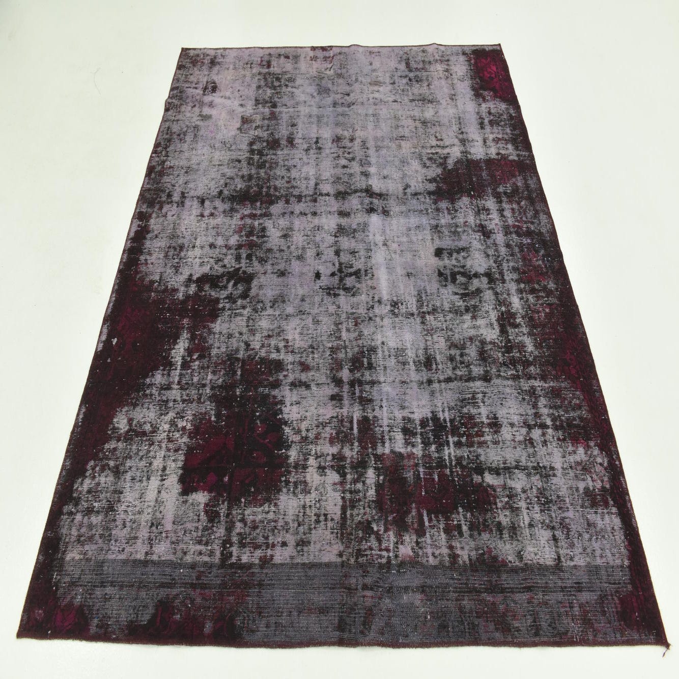 The rug's pattern offers a modern interpretation of classic design, creating a transitional aesthetic that bridges traditional and contemporary styles. The nuanced distressing suggests a storied heritage, giving the piece an heirloom quality without the age. The bold yet faded hues of violet, black, and burgundy provide a sense of depth and complexity to the rug, ensuring it commands attention without overwhelming a room's palette.