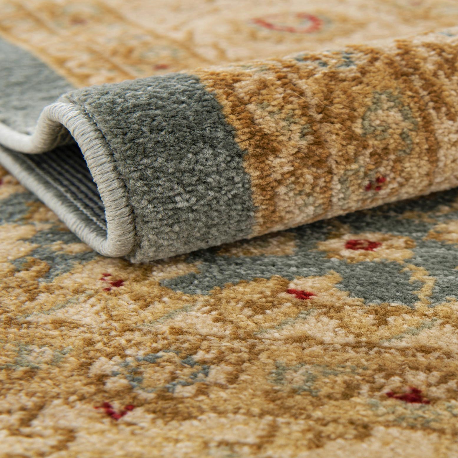 The Chelsea Collection offers a 7x10 area rug that is machine woven of 100% polypropylene, ensuring durability and ease of maintenance. The rug showcases a blue background complemented by an intricate pattern that embodies the richness of traditional design, with a well-balanced amalgamation of cream, beige, light brown, red, and light green hues. The ornate central medallion is surrounded by repeating floral motifs, enveloped by a cream border with delicate patterns, lending an heirloom quality to the piece.