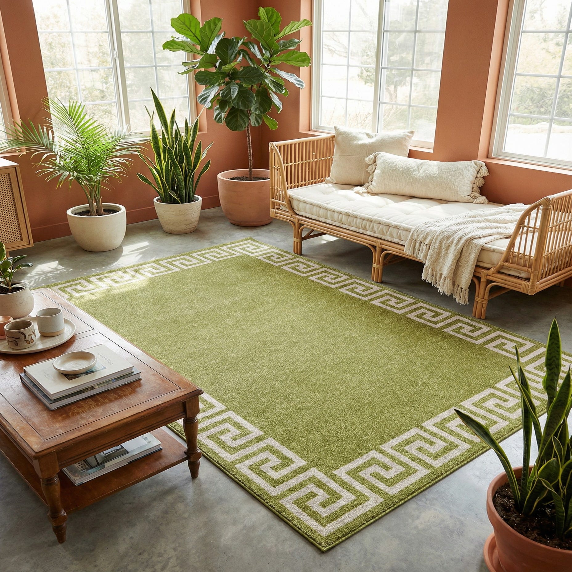 A clean Greek-key border in soft beige frames a solid light green field, giving this piece a crisp, architectural look that blends classical geometry with modern simplicity. The machine-made construction in 100% polypropylene yields a dense, low-profile pile with a smooth, slightly plush hand and a subtle sheen that catches light without overpowering the room. The beige border provides a restrained contrast that highlights the border motif while keeping the overall palette calm and cohesive.