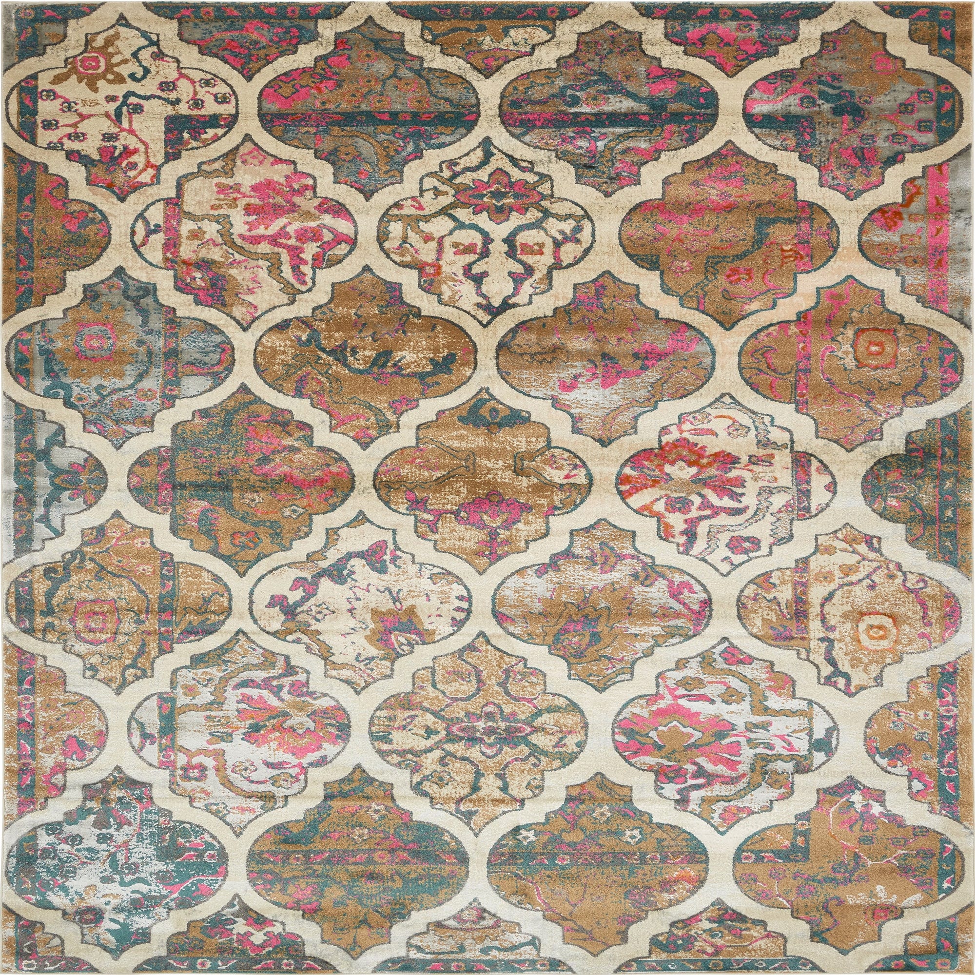 Primary color is Dark Beige. Colors in this rug include: Dark Beige, Green, Ivory, Navy Blue, Pink, Tan.