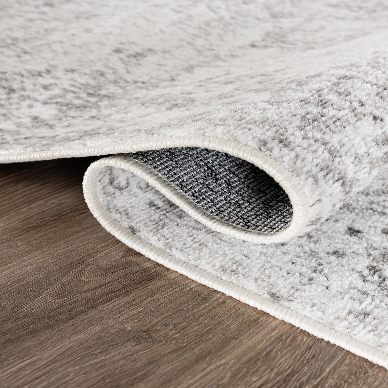 A softly distressed, vintage-inspired pattern gives this rug a lived-in, layered look: a muted medallion and faint border emerge in worn beige against a cool gray background, creating gentle contrast without competing with other décor. The overall effect is subtle and tonal, with the beige accents adding warmth to the cool gray field. Machine-made from 100% polypropylene, it has a low, even pile with a slightly velvety hand that feels smooth underfoot and shows a soft, light-reflecting finish where the fibers catch the light.