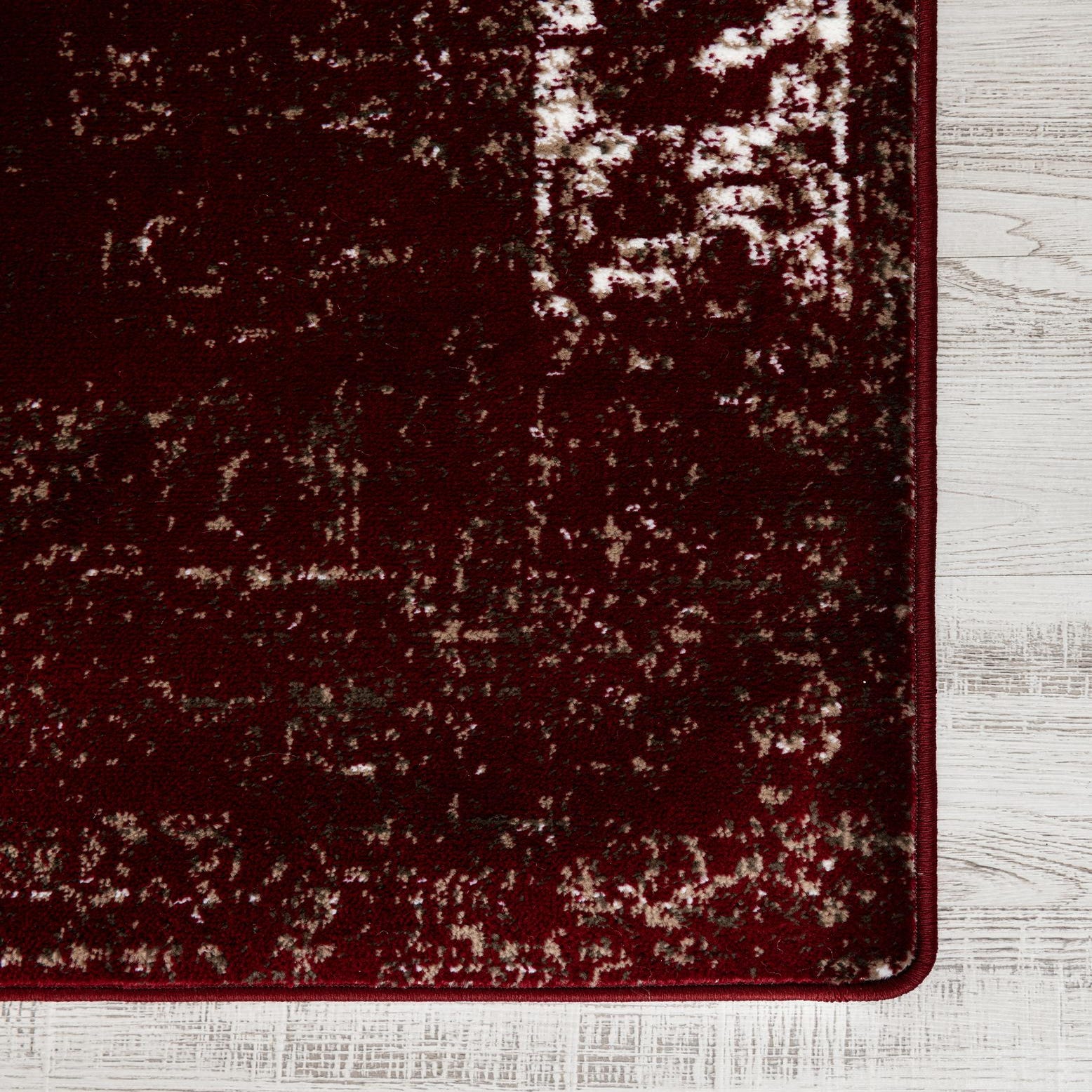 A rich burgundy field anchors this rug, punctuated by a distressed, low-contrast pattern in gray and ivory that reveals faint medallion motifs and a worn border. The overall style reads as vintage-inspired and transitional, offering depth and character without overwhelming a room. Machine-made from 100% polypropylene, the construction keeps the pattern crisp while maintaining an even, consistent surface.