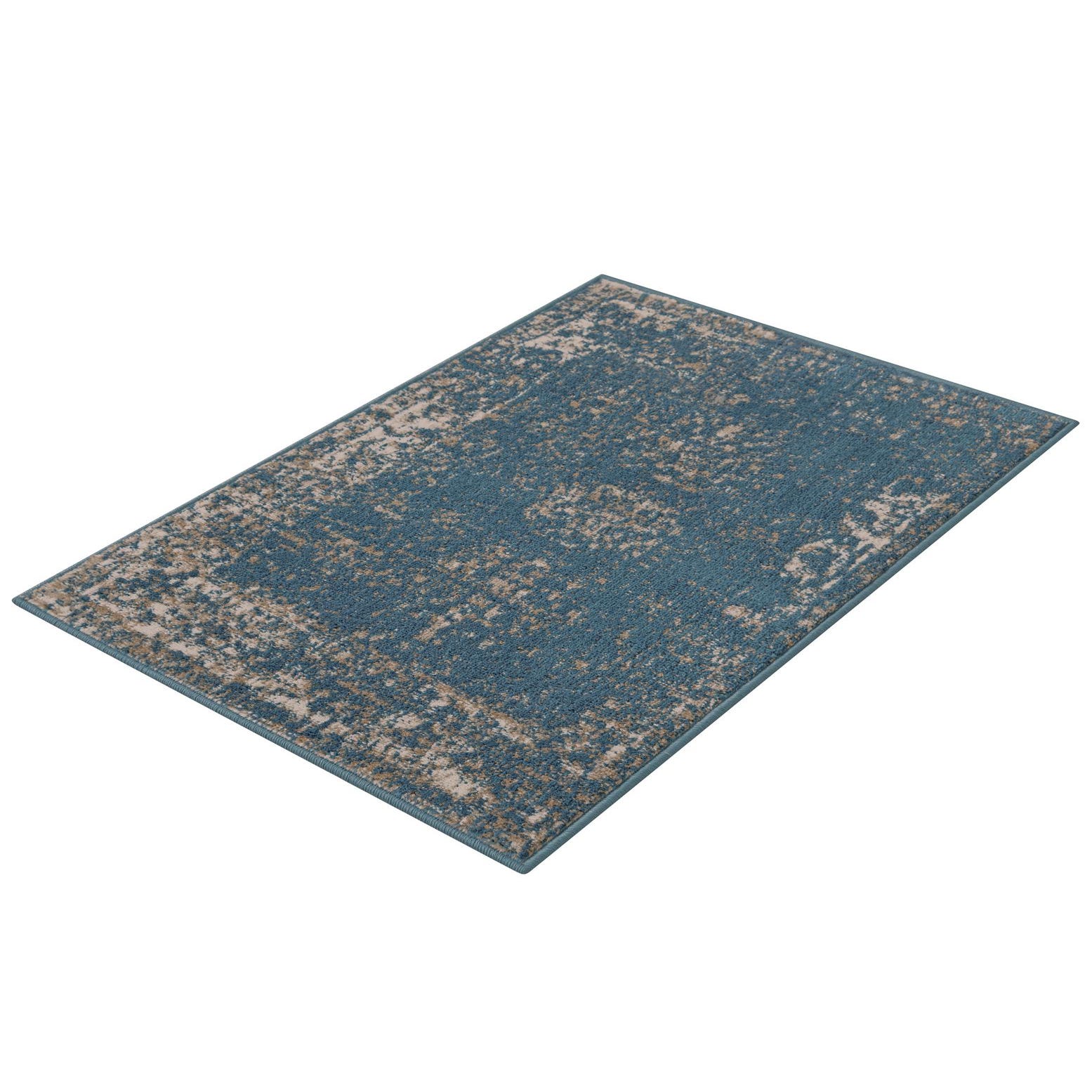 A soft, low-profile rug with a contemporary distressed pattern, the blue field serves as a calm backdrop for irregular beige and tan flecks that create a vintage-worn effect. The mottled surface and subtle edging add visual depth without a strong repeat, so the pattern reads as gently weathered rather than busy. Run your hand across the tight, even pile and you'll feel a smooth, slightly cushioned texture—machine-made from 100% polypropylene for consistent color and a neat, uniform weave.