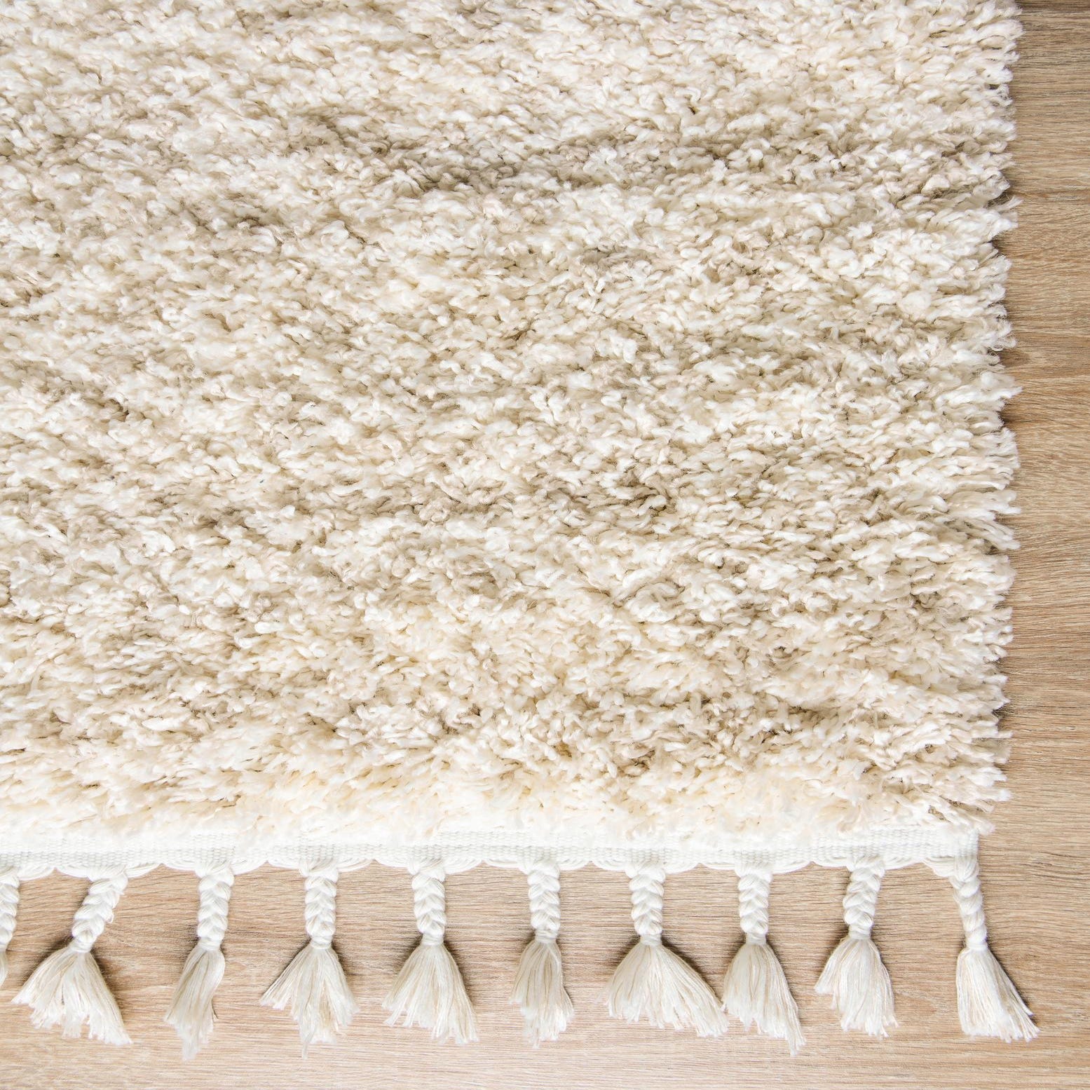 A soft ivory field forms the backdrop for a subtle, tonal pattern of beige fibers that create a gentle, speckled effect across the surface. The long, shag pile reads plush and layered, offering a tactile, cozy feel underfoot, and the short tasseled fringe at the ends adds a relaxed, casual finishing touch. The texture is invitingly dense without looking heavy, giving the rug a light, airy presence in neutral tones.