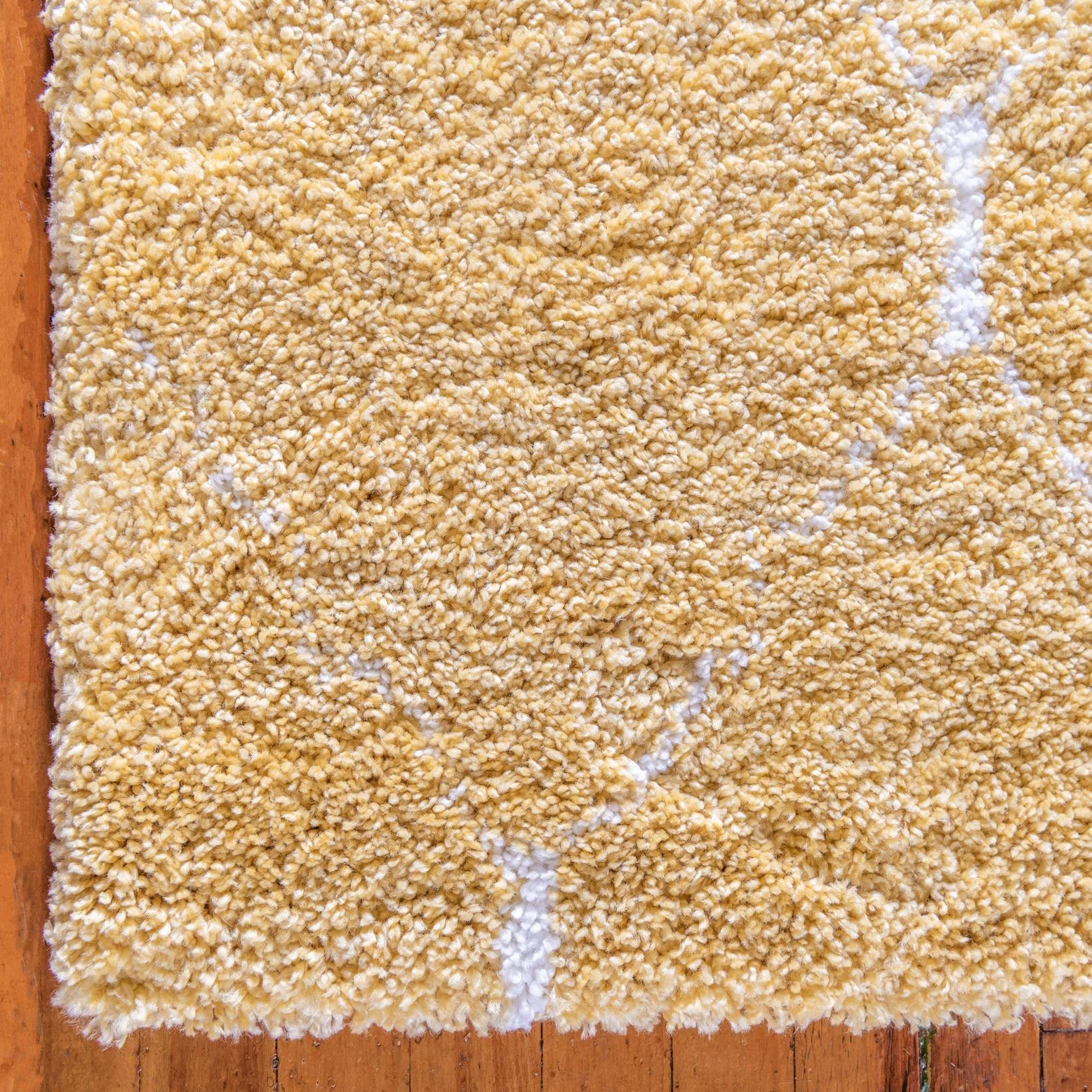 The rug's pattern showcases a simplistic and modern take on traditional Moroccan motifs, blending effortlessly into contemporary and bohemian decor settings. Its cheerful yellow hue can serve as an uplifting centerpiece in living rooms, bedrooms, or playrooms, bringing a burst of color to neutral tones or harmonizing with a colorful palette. Ideal for spaces that crave a touch of softness and a dash of color, this rug seamlessly balances comfort with a lively aesthetic, suitable for high-traffic areas and active households.