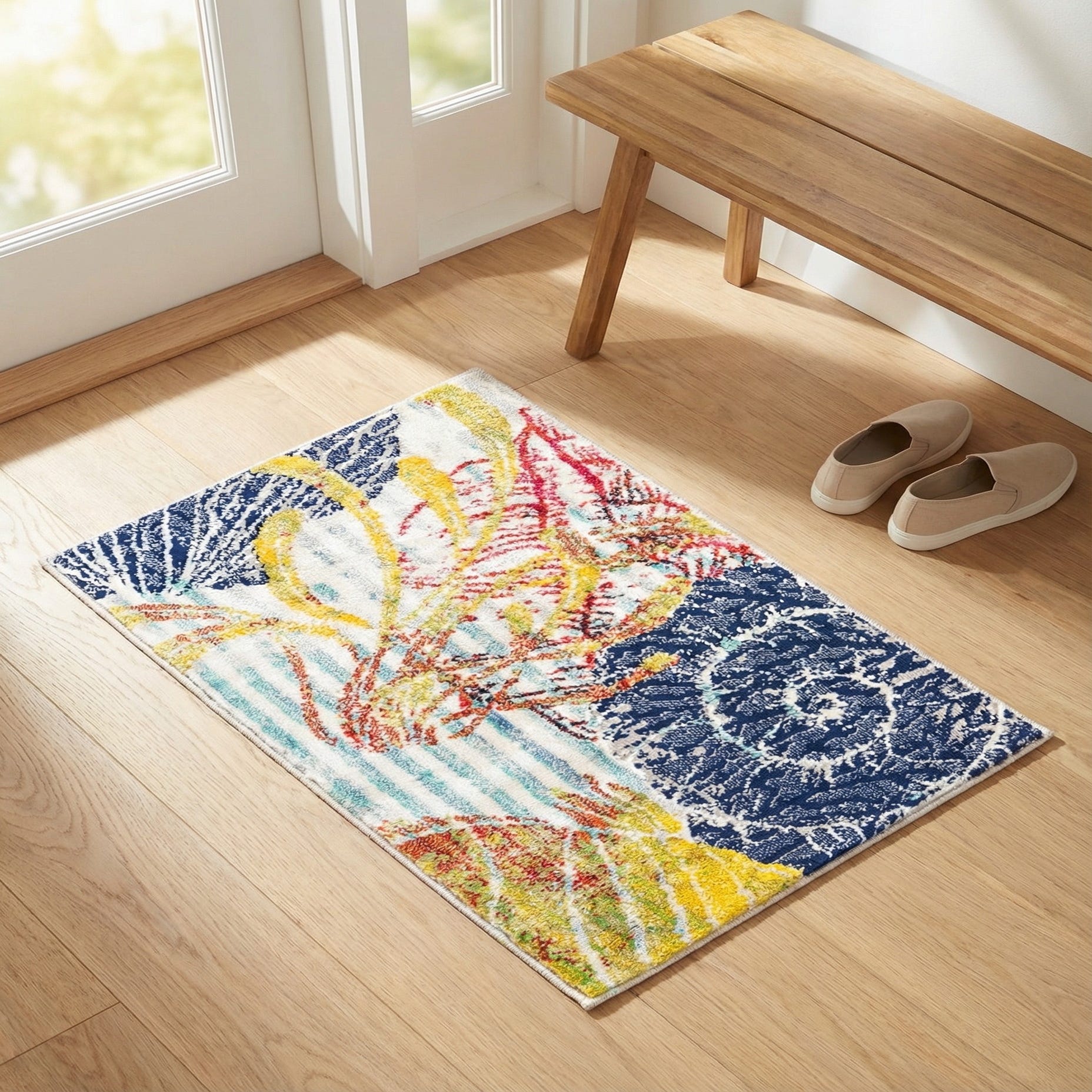 An abstract, painterly design mixes spiraling shell motifs, loose botanical fronds and soft vertical striping across a multi background. Navy spirals anchor the composition while pops of yellow, red and pink weave through light blue, green, ivory and gray accents, creating a lively, layered look. The textured pile has varied heights that give the colored motifs a slightly raised, tactile quality and the polyester highlights add a subtle sheen to the surface.