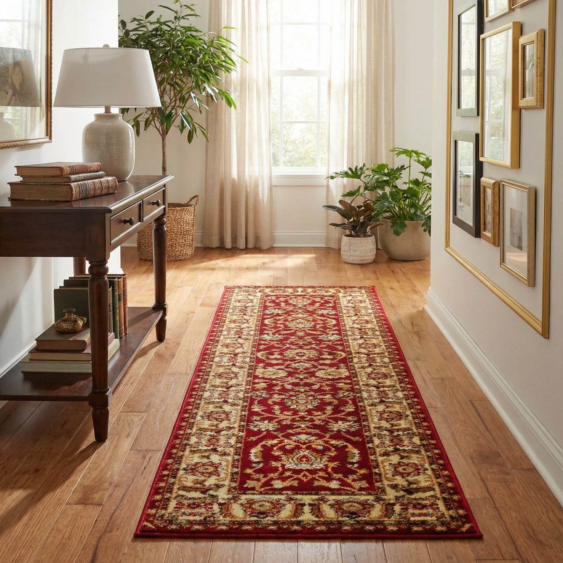 This runner works well in classic and transitional interiors: place it in a formal hallway, alongside a dark-wood console in an entry, or down a narrow kitchen for a touch of pattern and color. The red ground pairs cleanly with warm wood tones, leather seating and brass accents, while the cream and tan highlights soften the overall look and coordinate with neutral upholstery or painted trim.