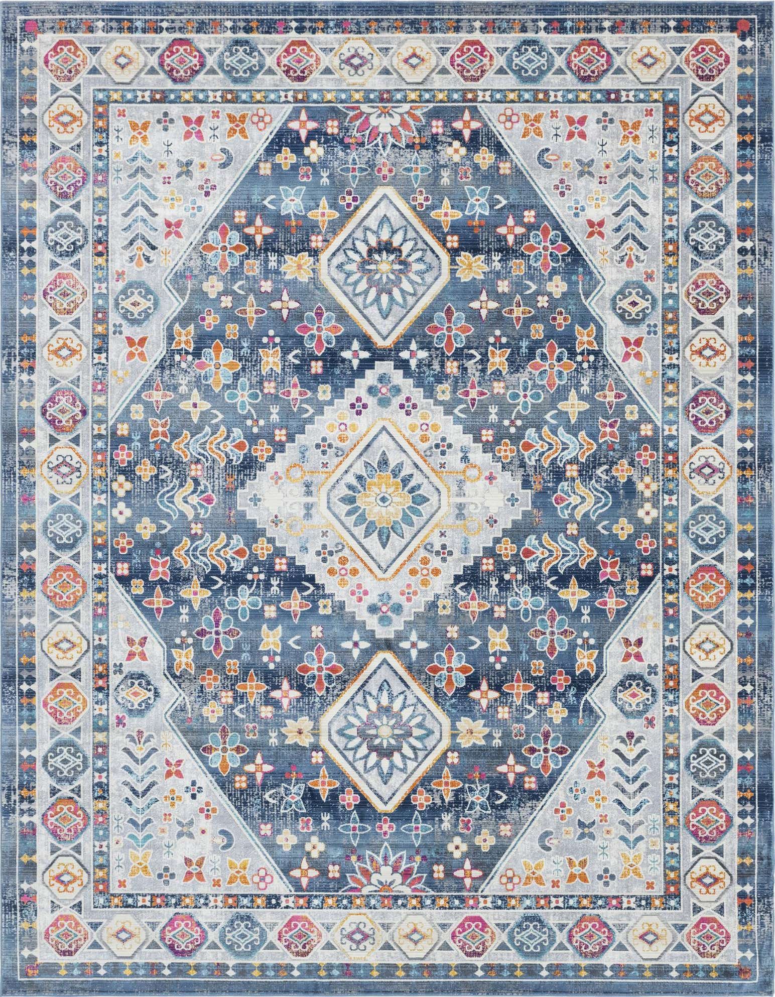 Primary color is Blue. Colors in this rug include: Blue, Black, Brown, Burgundy, Gold, Gray, Ivory, Red, Pink.