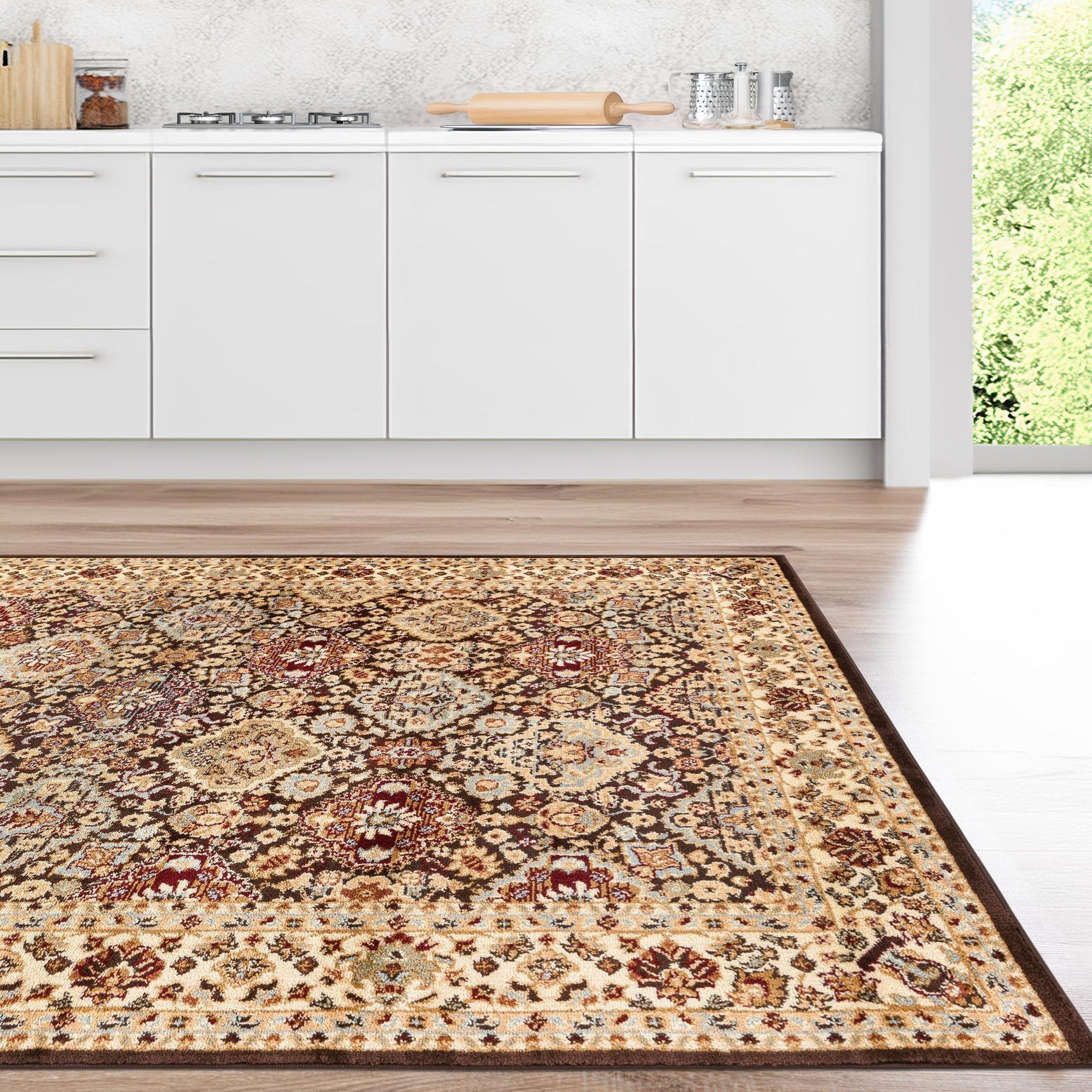 With its classic design and warm color scheme, the rug is versatile for blending into traditional interiors and can add depth to modern settings that honor timeless elements. It would complement wood flooring, enhance neutral color schemes, or serve as a counterpoint to minimalist decor. Given the rug's substantial dimension, it is ideal as an anchoring element in spacious living areas, under dining tables seating eight or more, or in an open-plan space that benefits from defined zones.