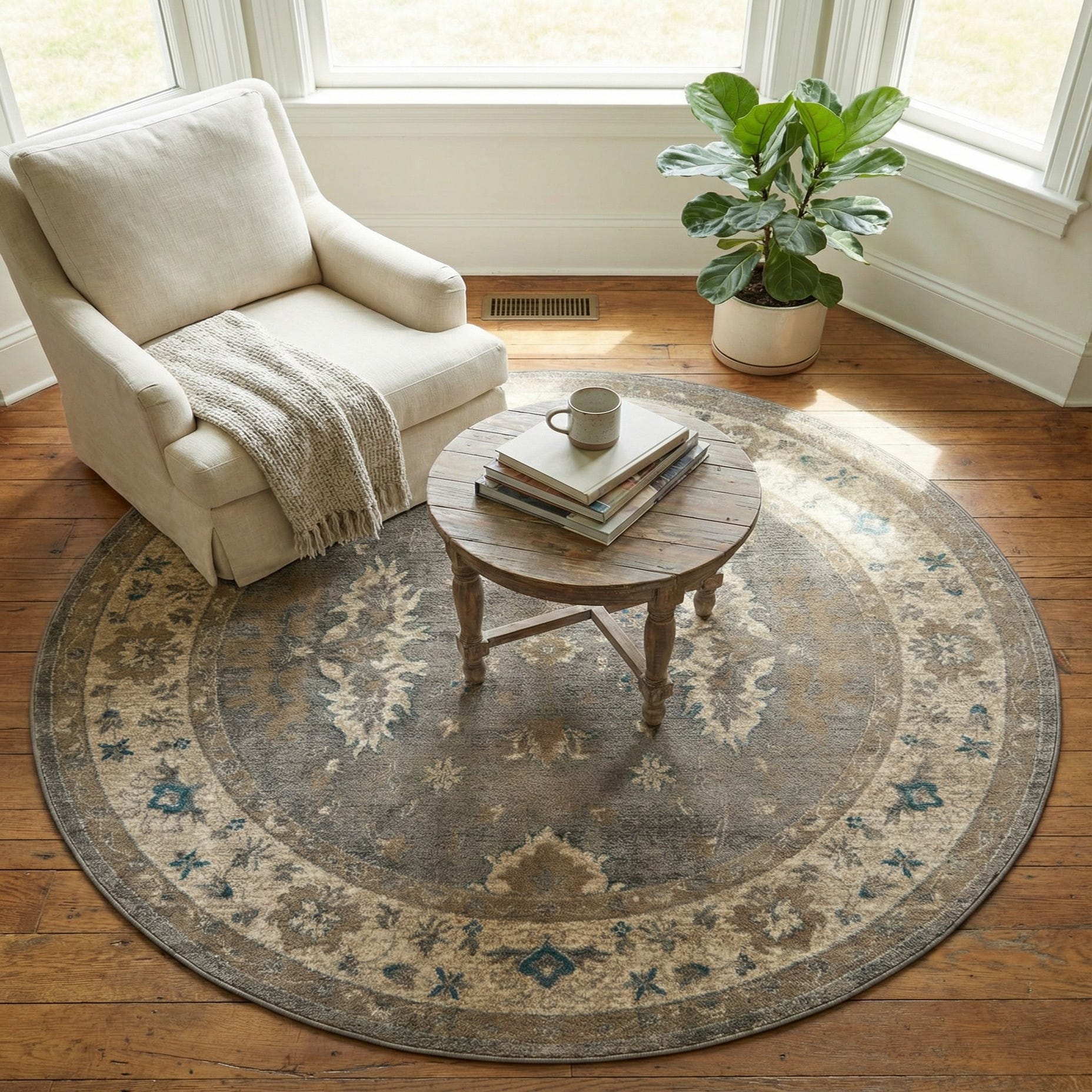A classic round area rug with a softly distressed, vintage-inspired pattern. The gray background sets a muted stage for a central medallion and scattered floral motifs in beige, with subtle light blue accents tucked into the border and field. The border carries a traditional vine-and-flower band that frames the central design, giving the rug a balanced, lived-in look that blends antique and transitional styles.