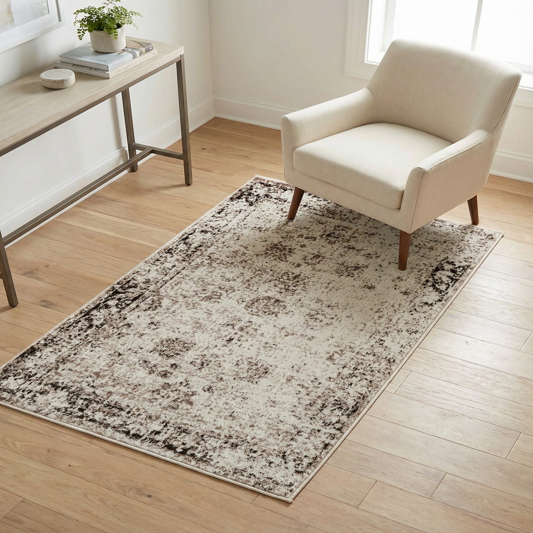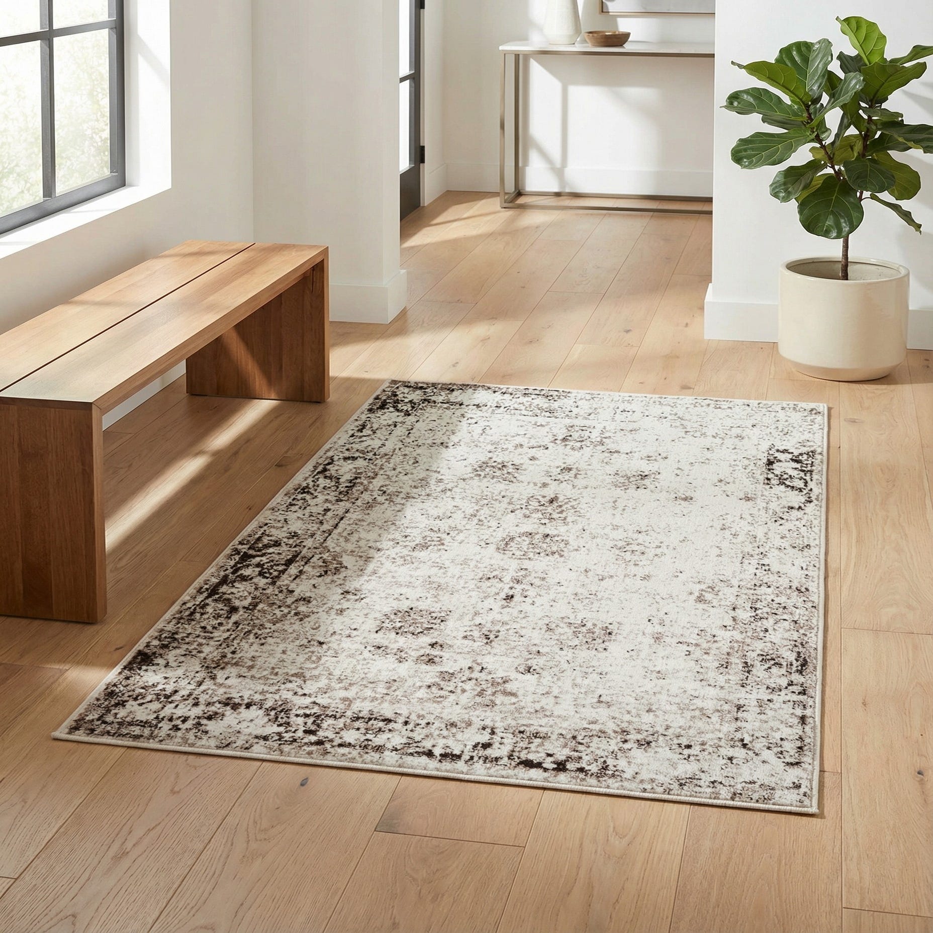 This rug works well in neutral, transitional schemes where you want layered warmth without overpowering other finishes. Place it beneath a compact seating area or in an entryway to anchor wood or tile floors, or use it as a bedside layer to soften a modern bedroom palette. It pairs particularly well with natural woods, leather accents, and linen upholstery, and fits equally well in minimalist, farmhouse, or casual contemporary interiors.