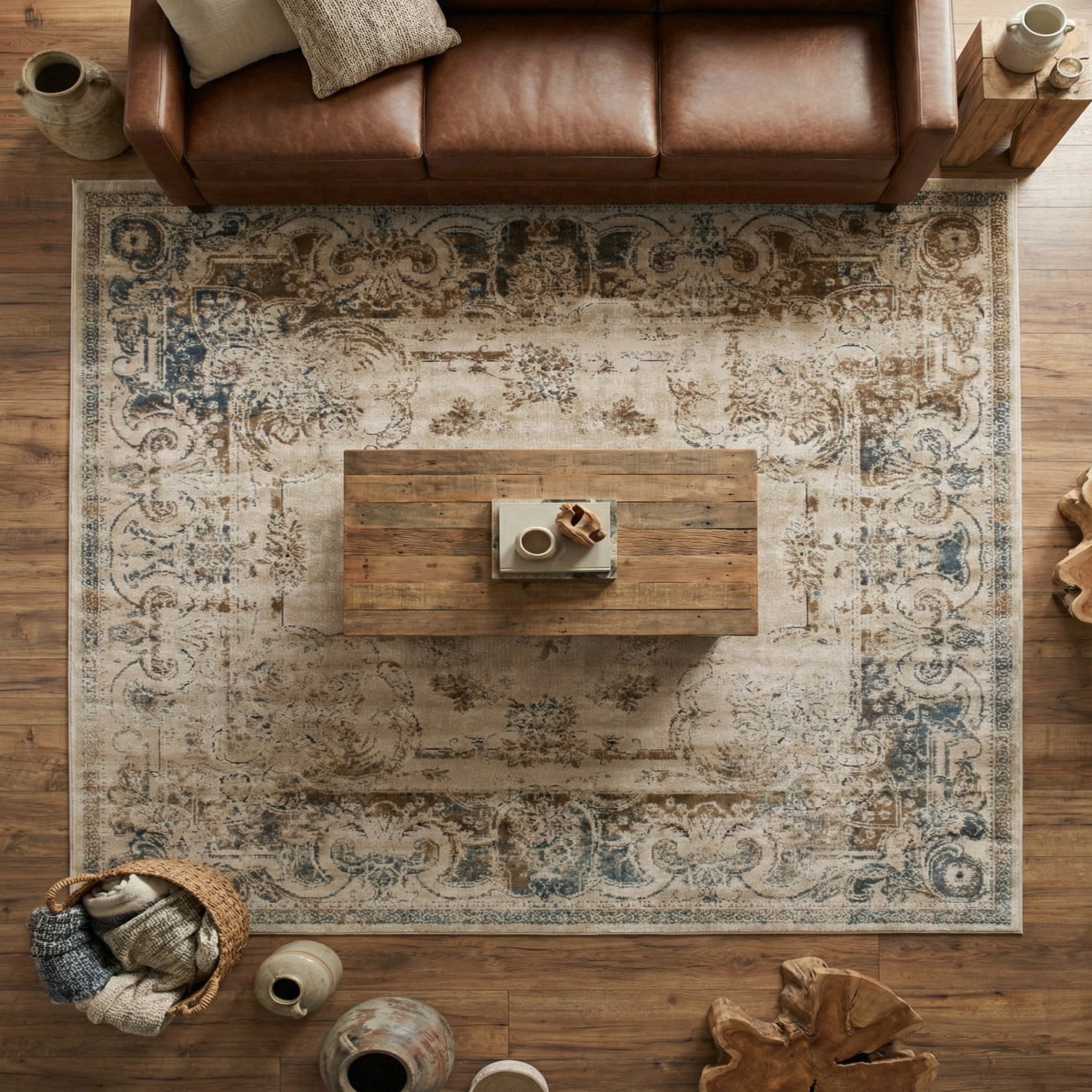 A faded medallion takes center stage within an ornate scrollwork border, rendered in a gently distressed, vintage-inspired pattern. The Blue Cream background sets a soft, airy base while layered accents of brown, blue, gray, and beige add depth and character. The worn detailing and open field create a balanced look that blends traditional motifs with a relaxed, lived-in aesthetic.